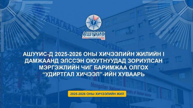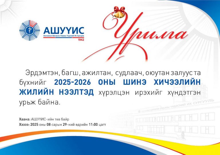 ЭРДЭМТЭН, БАГШ, АЖИЛТАН, СУДЛААЧ, ОЮУТАН ЗАЛУУС ТА БҮГДИЙГ АШУҮИС-ИЙН 2025-2026 ОНЫ ШИНЭ ХИЧЭЭЛИЙН ЖИЛИЙН НЭЭЛТЭД ХҮРЭЛЦЭН ИРЭХИЙГ ХҮНДЭТГЭН УРЬЖ БАЙНА.
