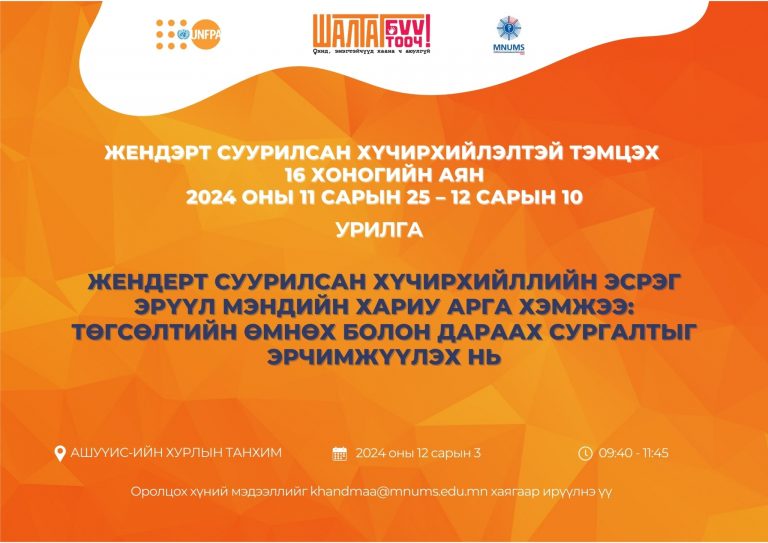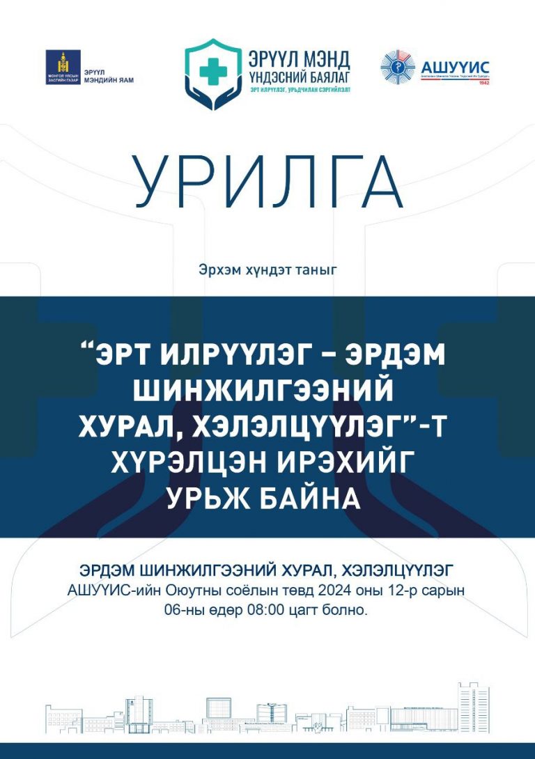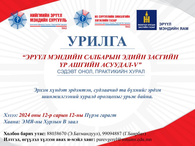 Та бүхнийг 2024 оны 12-р сарын 12-нд зохион байгуулагдах “Эрүүл мэндийн салбарын эдийн засгийн үр ашгийн асуудалд-V” сэдэвт онол, практикийн хуралд оролцохыг урьж байна. Хуралд илгээх илтгэлийн хураангуй, өгүүллийг 2024 оны 12-р сарын 04-ний өдрийн 17:00 цаг хүртэл болж сунгагдлаа.…