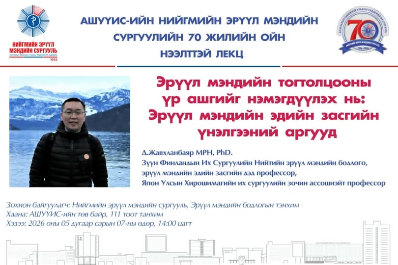 Анагаахын шинжлэх ухааны үндэсний их сургууль болон Зүүн Финландын их сургуулийн хамтын ажиллагаа, Нийгмийн эрүүл мэндийн сургуулийн 70 жилийн ойн хүрээнд Эрүүл мэндийн бодлогын тэнхимээс “Эрүүл мэндийн системийн үр ашгийг сайжруулах нь: Эрүүл мэндийн эдийн засгийн үнэлгээний аргууд” сэдэвт нээлттэй лекцийг зохион байгуулах гэж байна. Лекцийг Зүүн Финландын их сургуулийн Нийтийн эрүүл мэндийн бодлого, эрүүл мэндийн эдийн засгийн дэд профессор, Япон Улсын Хирошимагийн их сургуулийн зочин профессор, доктор Д.Жавхланбаяр удирдан явуулна.