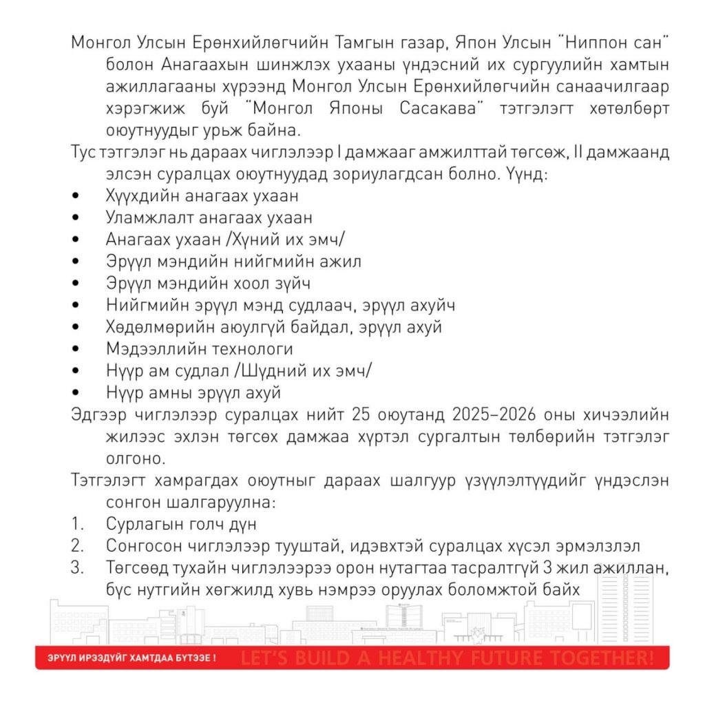 Монгол Улсын Ерөнхийлөгчийн Тамгын газар, Япон Улсын “Ниппон сан” болон Анагаахын шинжлэх ухааны үндэсний их сургуулийн хамтын ажиллагааны хүрээнд Монгол Улсын Ерөнхийлөгчийн санаачилгаар хэрэгжиж буй “Монгол Японы Сасакава” тэтгэлэгт хөтөлбөрт оюутнуудыг урьж байна.
