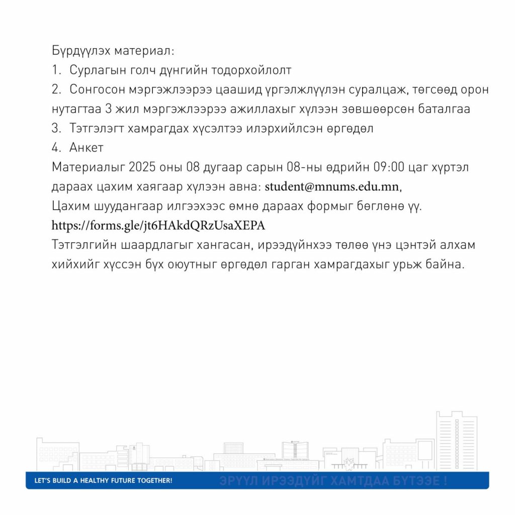 Материалыг 2025 оны 08 дугаар сарын 08-ны өдрийн 09:00 цаг хүртэл дараах цахим хаягаар хүлээн авна: student@mnums.edu.mn,