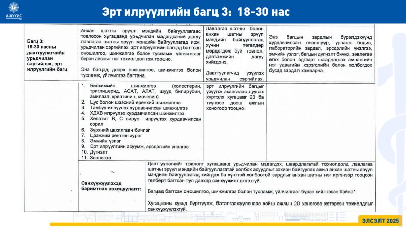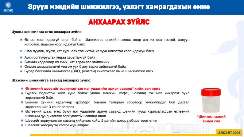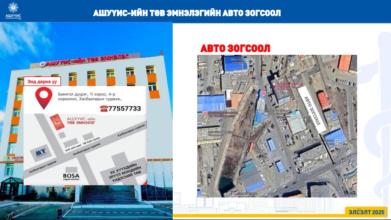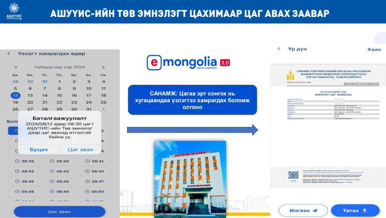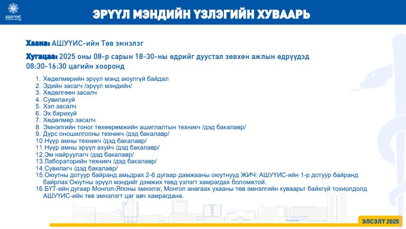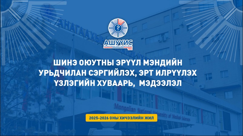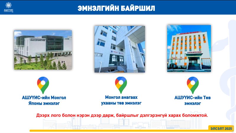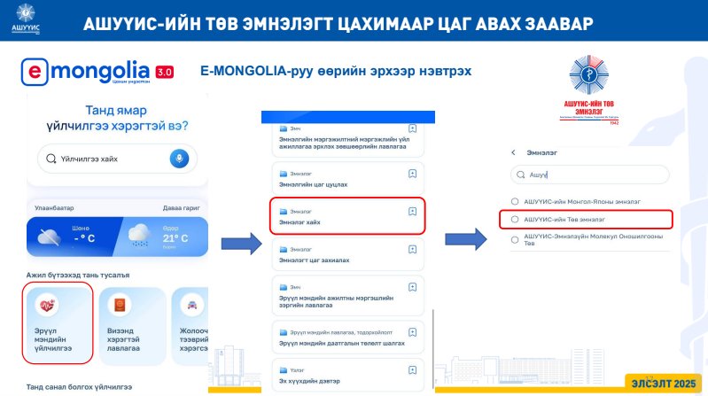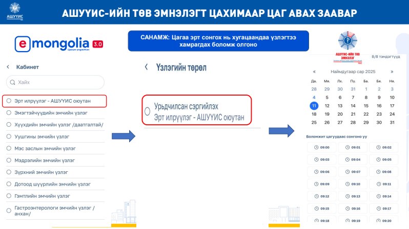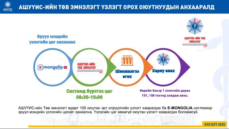 АШУҮИС-ийн Төв эмнэлэгт өдөрт 100 оюутан эрт илрүүлгийн үзлэгт хамрагдах ба E-Mongolia системээр эрүүл мэндийн үзлэгийн цаг захиална. Үзлэгийн цаг аваагүй оюутан үзлэгт хамрагдах боломжгүй.