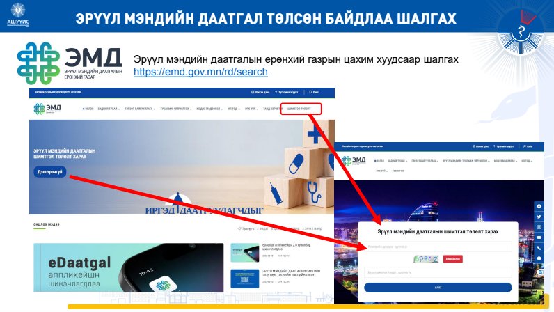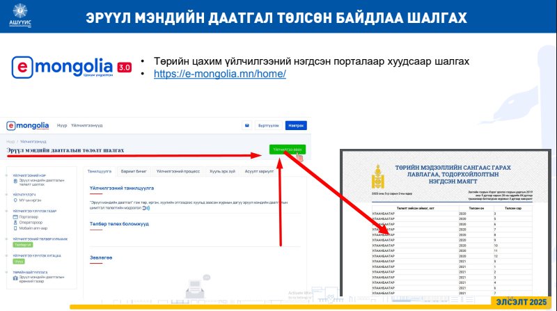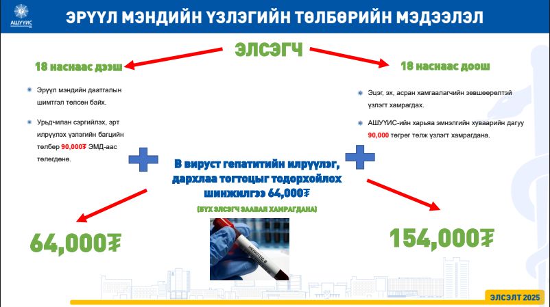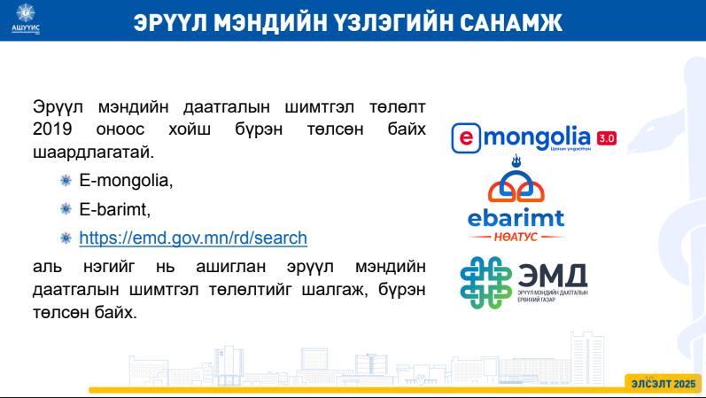 Үзлэгт хамрагдах оюутнууд эрүүл мэндийн даатгалын шимтгэл төлөлт 2019 оноос хойш бүрэн төлсөн байх шаардлагатай ба E-Mongolia, E-Barimt, ЭМД-ын газрын веб хуудас аль нэгийг ашиглан эрүүл мэндийн даатгалын шимтгэл төлөлтийг шалгаж, бүрэн төлсөн байх