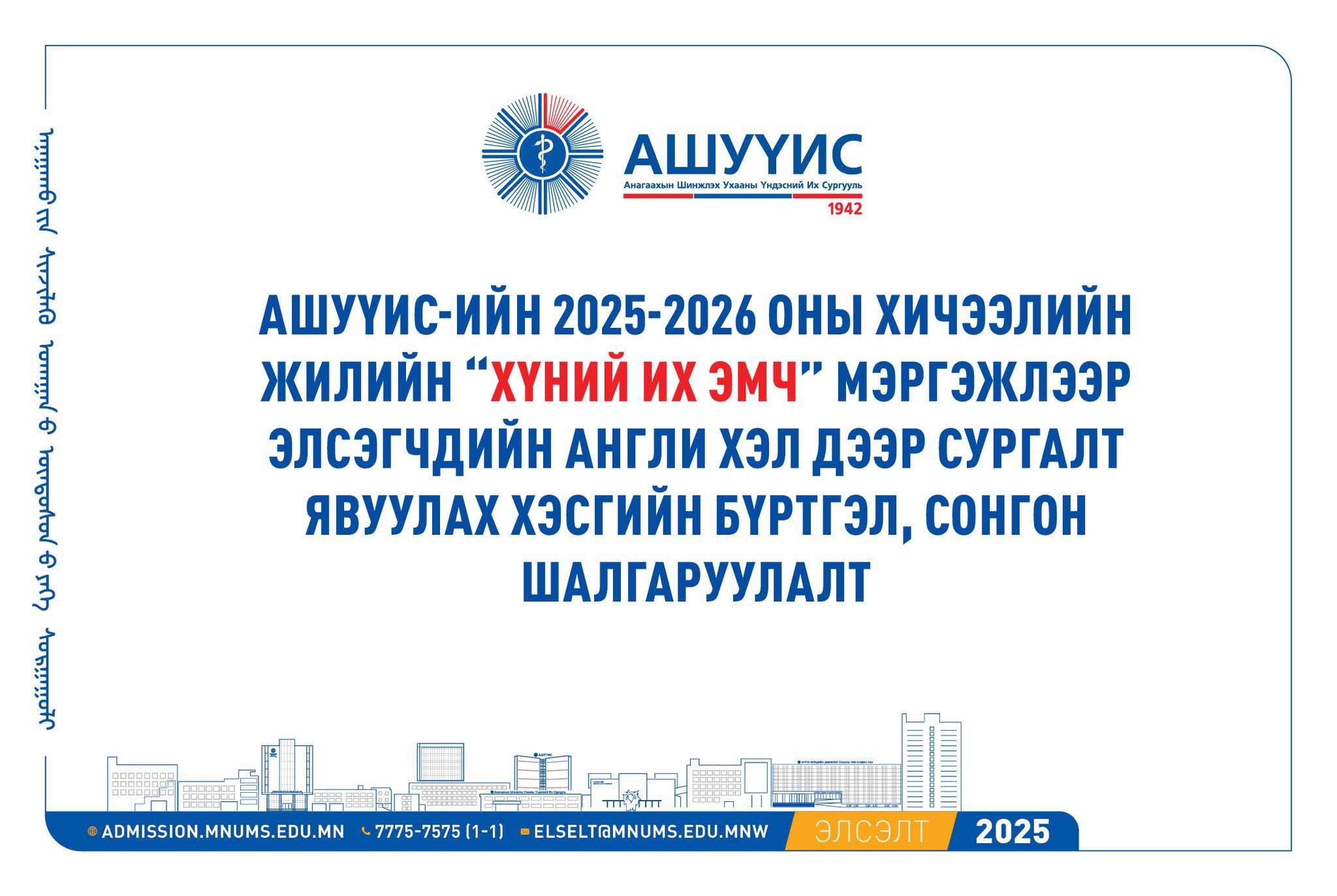 Англи хэлний ангийн бүртгэлийн хугацаанд (2025 оны 08 сарын 15-22) IELTS 7.5 оноотой оюутны тоо дутвал тус холбоосоор бүртгүүлж, нэмэлт шалгалт өгч элсэнэ.