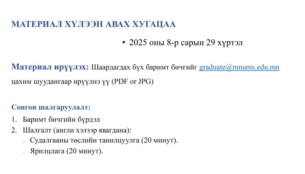 АШУҮИС-ийн багш, эмч нар материалаа 2025 оны 8 дугаар сарын 29-өдрийн 17:00 цагаас өмнө Эрдмийн сургуулийн graduate@mnums.edu.mn цахим шууданруу 1 PDF File болгон илгээнэ үү.