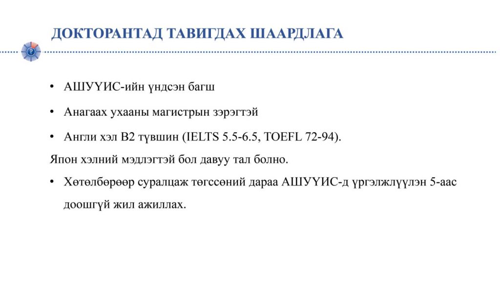 Энэхүү хөтөлбөрт хамрагдсанаар Монгол, Японы их сургуулийн профессоруудын удирдлага дор орчин үеийн технологи, техник хэрэгсэл бүхий лабораторид судалгаа хийн хөндлөнгийн үнэлгээ бүхий эрдэм шинжилгээний олон улсын сэтгүүлд судалгааны үр дүнгээр өгүүлэл нийтлүүлэн АШУҮИС болон Ойта Их Сургуульд доктор (Ph.D)-ын зэрэг хамгаална.