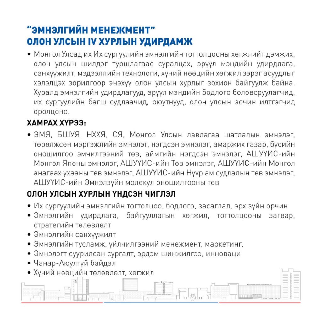 – Эмнэлгийн тусламж, үйлчилгээний менежмент, маркетинг,