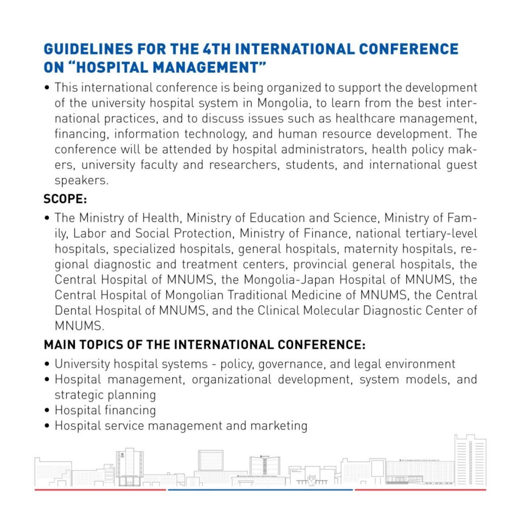 • The Mongolia-Japan Hospital of MNUMS, the Central Hospital of MNUMS, the Central Hospital of Mongolian Traditional Medicine of MNUMS, and the Central Dental Hospital of MNUMS