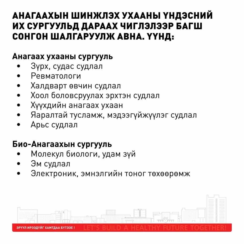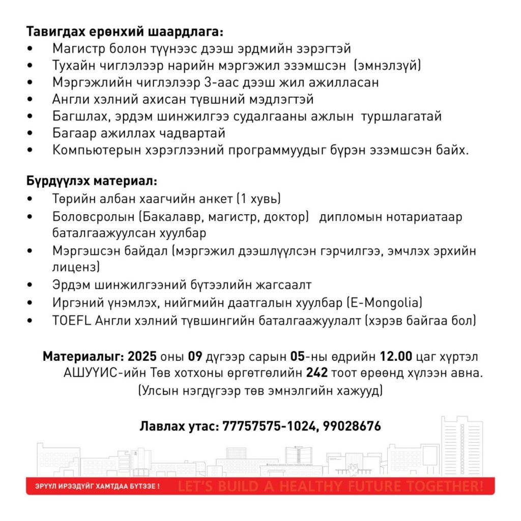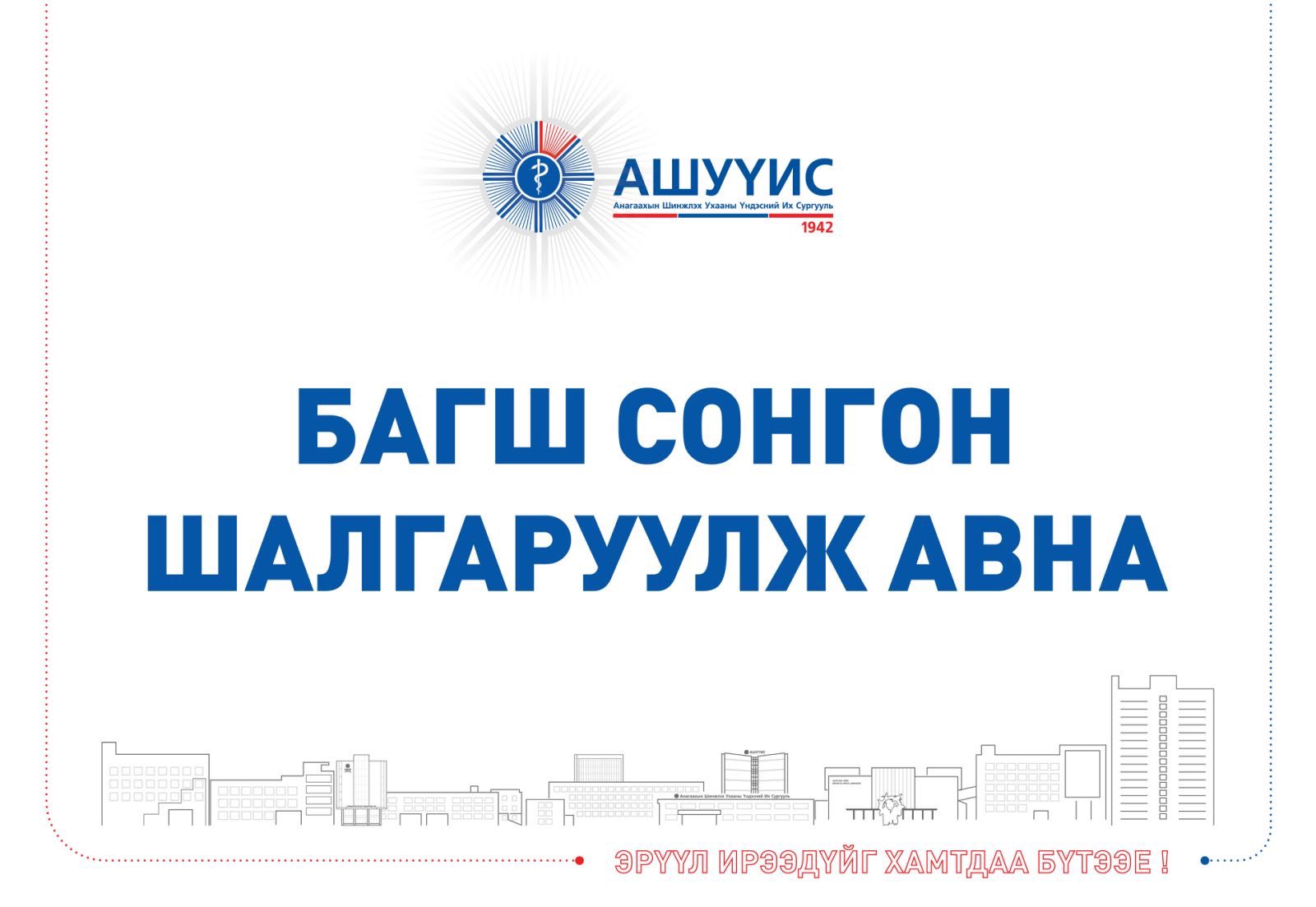 АШУҮИС-Д БАГШ СОНГОН ШАЛГАРУУЛЖ АВНАBattsetseg DAugust 26, 2025МЭДЭЭ, Мэдээ Previous Post АШУҮИС-ИЙН ТӨВ ЭМНЭЛЭГТ МЭДРЭЛИЙН ЭМЧ СОНГОН ШАЛГАРУУЛЖ АВНА Next Post АШУҮИС-ИЙН САНХҮҮ, ЭДИЙН ЗАСГИЙН ЗАСГИЙН ГАЗАРТ ЭДИЙН ЗАСАГЧ, НЯГТЛАН БОДОГЧ, НЯРАВ АЖИЛД АВНА