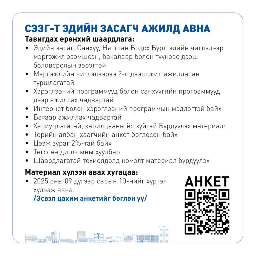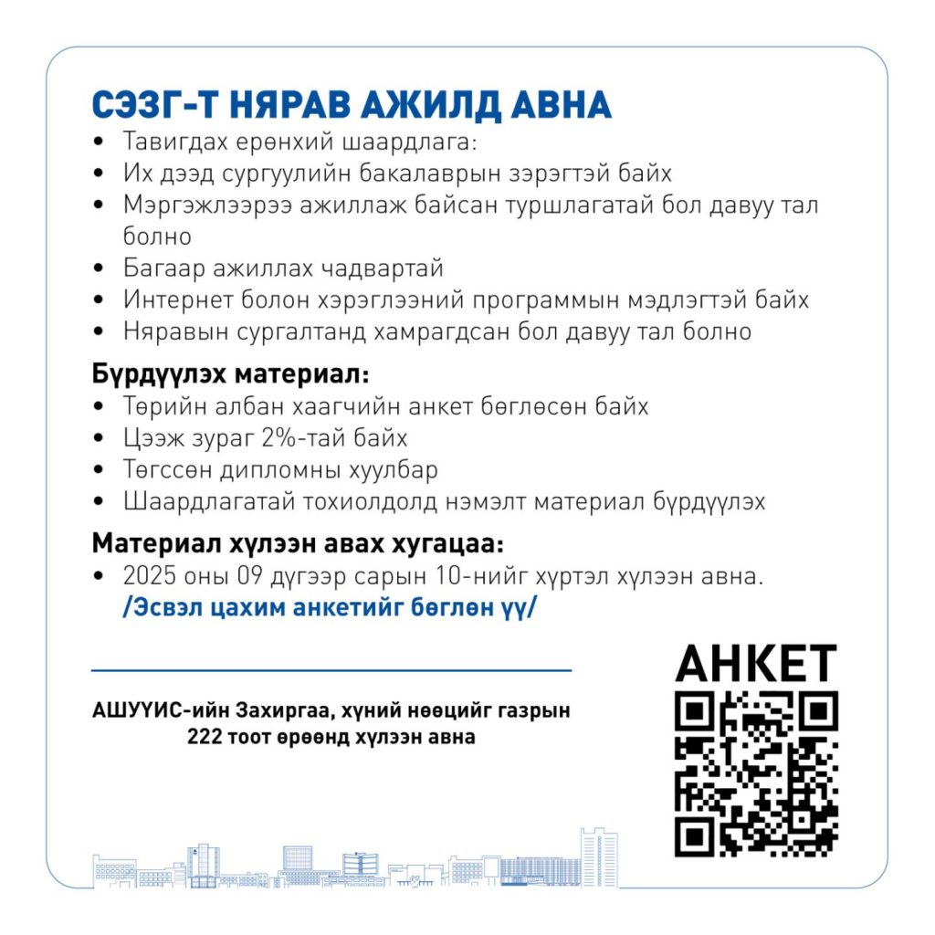 АШУҮИС-ИЙН САНХҮҮ, ЭДИЙН ЗАСГИЙН ЗАСГИЙН ГАЗАРТ ЭДИЙН ЗАСАГЧ, НЯГТЛАН БОДОГЧ, НЯРАВ АЖИЛД АВНАBattsetseg DAugust 26, 2025МЭДЭЭ, Мэдээ Previous Post АШУҮИС-Д БАГШ СОНГОН ШАЛГАРУУЛЖ АВНА Next Post АШУҮИС-ИЙН НИЙГМИЙН ЭРҮҮЛ МЭНДИЙН СУРГУУЛЬД ХИЧЭЭЛИЙН ТУСЛАХ АЖИЛТАН ШАЛГАРУУЛЖ АВНА
