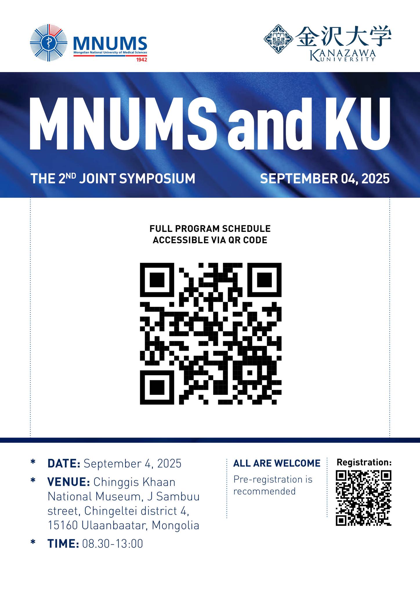 АШУҮИС нь Япон улсын Каназава их сургуультай хамтран “MNUMS–KU Joint Symposium” эрдэм шинжилгээний хурлыг жил бүр уламжлал болгон зохион байгуулж байна. Энэ удаагийн хурал 2025 оны 9 сарын 4-ний өдрийн 09:00-13:00 цагт