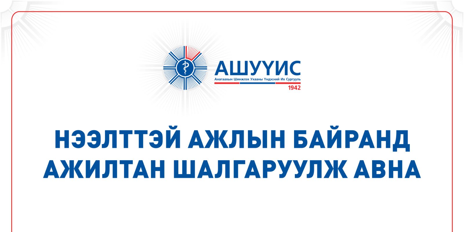 ДАРААХ АЖЛЫН БАЙРАНД АЖИЛТАН ШАЛГАРУУЛЖ АВНАBattsetseg DSeptember 3, 2025МЭДЭЭ, Мэдээ Previous Post АШУҮИС-ийн Говь-Алтай аймаг дахь салбар Анагаах ухааны сургуулийн 2025-2026 оны хичээлийн шинэ жилийн нээлт боллоо Next Post СУДАЛГААНЫ ТӨСӨЛД СУДЛААЧ СОНГОН ШАЛГАРУУЛНА