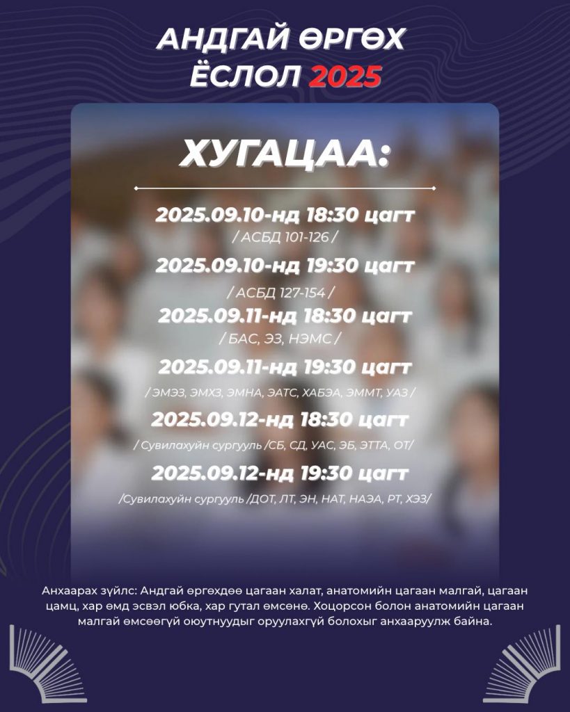 АШУҮИС-ИЙН ШИНЭ ЭЛСЭГЧИД ОЮУТНЫ АНДГАЙ ӨРГӨНӨBattsetseg DSeptember 9, 2025МЭДЭЭ, Мэдээ 2025-2026 оны элсэгчдийн анхааралд! АШУҮИС-д элсэн суралцаж буй I дамжааны оюутнуудын “Андгай өргөх ёслол”-ын үйл ажиллагаа 2025 оны 09 дүгээр сарын 10,11 болон 12-ны өдрүүдэд “Оюутны соёлын төв”-д зохион байгуулагдана. Previous Post Архангай аймаг дахь АШУҮИС-ийн эмнэлгийн “УАУ-ны клиник” үүд хаалгаа нээж байгаатай холбогдуулан “УАУ-ны Нээлттэй өдөрлөг”-ийг зохион байгуулж 350 гаруй иргэдэд эмчилгээ оношилгоо хийлээ. Next Post АШУҮИС-ИЙН 2025-2026 ОНЫ ХИЧЭЭЛИЙН ЖИЛИЙН 1-Р УЛИРЛЫН “ОЮУТНЫ ХӨГЖЛИЙН ЗЭЭЛ”-Д ХАМРАГДАХ ЗААВАРЧИЛГАА