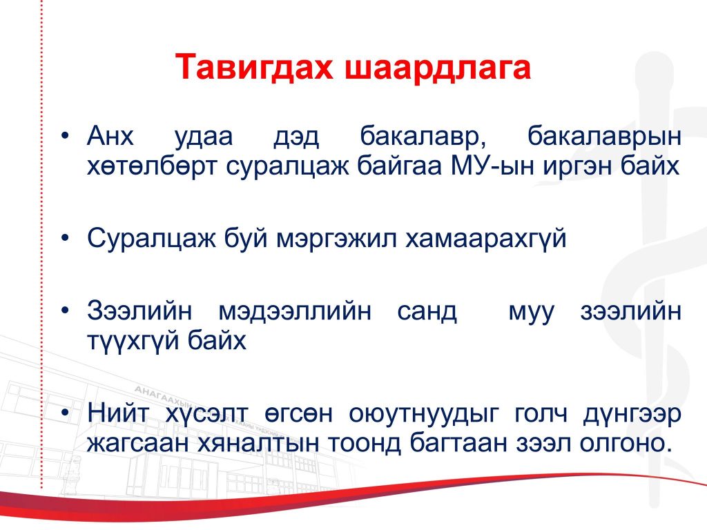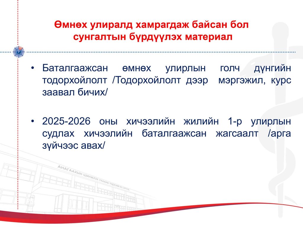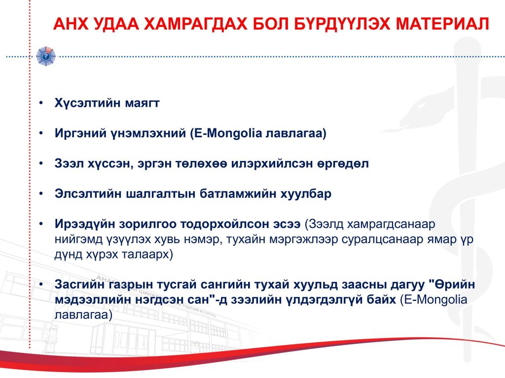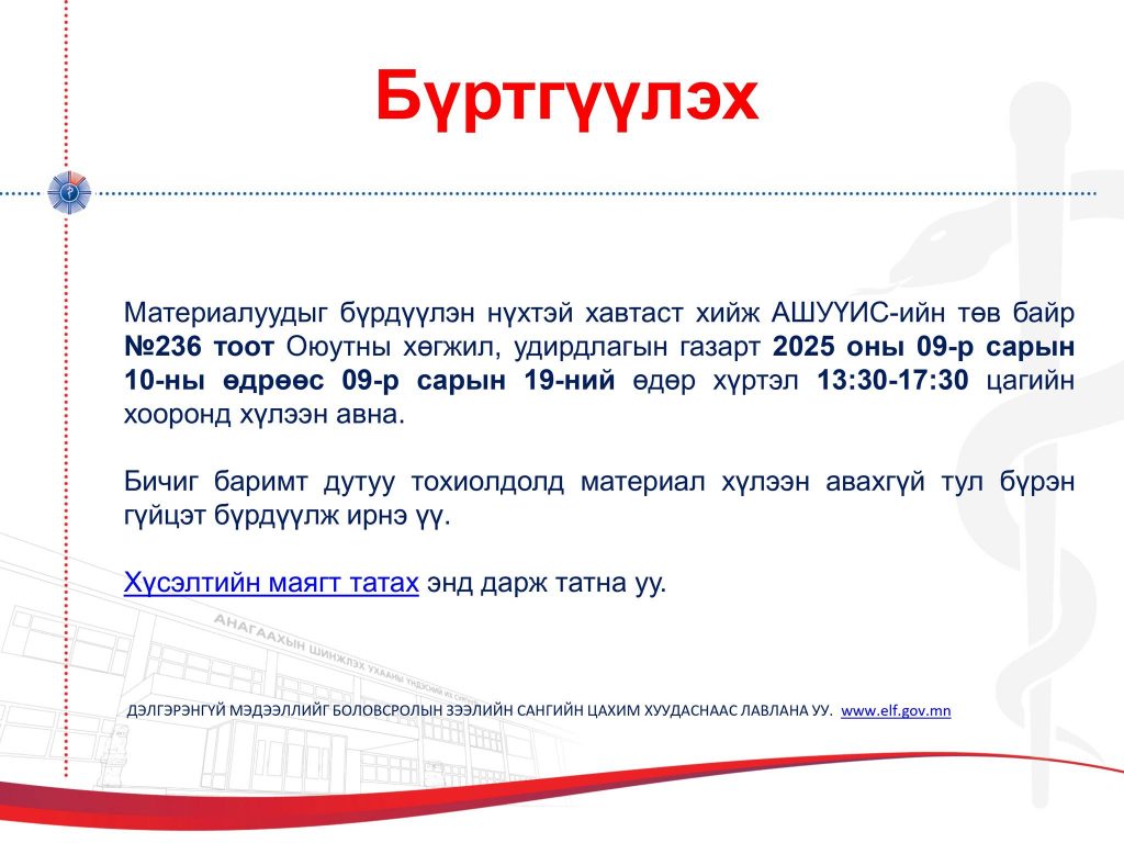 Бичиг баримт дутуу тохиолдолд материал хүлээн авахгүй тул бүрэн гүйцэт бүрдүүлж ирнэ үү.