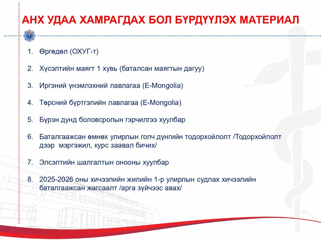 Бичиг баримт дутуу тохиолдолд материал хүлээн авахгүй тул бүрэн гүйцэт бүрдүүлж ирнэ үү.