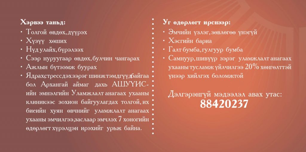 АРХАНГАЙ АЙМАГ ДАХЬ ХАНГАЙН БҮСИЙН АШУҮИС-ИЙН СУВИЛАХУЙН СУРГАЛТ, ЭРДЭМ ШИНЖИЛГЭЭ, ЭРҮҮЛ МЭНДИЙН ТУСЛАМЖ ҮЙЛЧИЛГЭЭНИЙ ЦОГЦОЛБОР НЬ “УЛАМЖЛАЛТ АНАГААХ УХААНААР ЭРҮҮЛЖЬЕ” АЯНГ ЭХЛҮҮЛЖ БАЙНАBattsetseg DSeptember 16, 2025МЭДЭЭ, Мэдээ Previous Post АРХАНГАЙ АЙМАГ ДАХЬ ХАНГАЙН БҮСИЙН АШУҮИС-ИЙН МУВИЛАХУЙН СУРГАЛТ, ЭРДЭМ ШИНЖИЛГЭЭ, ЭРҮҮЛ МЭНДИЙН ТУСЛАМЖ ҮЙЛЧИЛГЭЭНИЙ ЦОГЦОЛБОР НЬ “УЛАМЖЛАЛТ АНАГААХ УХААНААР ЭРҮҮЛЖЬЕ” АЯНГ ЭХЛҮҮЛЖ БАЙНА Next Post АРХАНГАЙ АЙМАГ ДАХЬ АШУҮИС-ИЙН СУВИЛАХУЙН СУРГУУЛЬД ДАРААХ АЖЛЫН БАЙРАНД АЖИЛТАН ШАЛГАРУУЛЖ АВНА