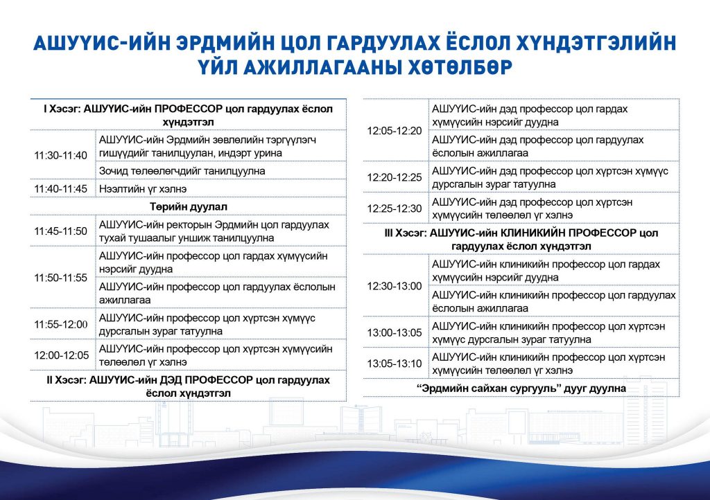Анагаахын Шинжлэх Ухааны Үндэсний Их Сургуулийн “Эрдмийн цол гардуулах ёслол”-ын үйл ажиллагаа 2025 оны 10 дугаар сарын 03-ны өдрийн 11:30 цагm “Оюутны соёлын төв”-д болох тул та бүхнийг оролцохыг урьж байна.