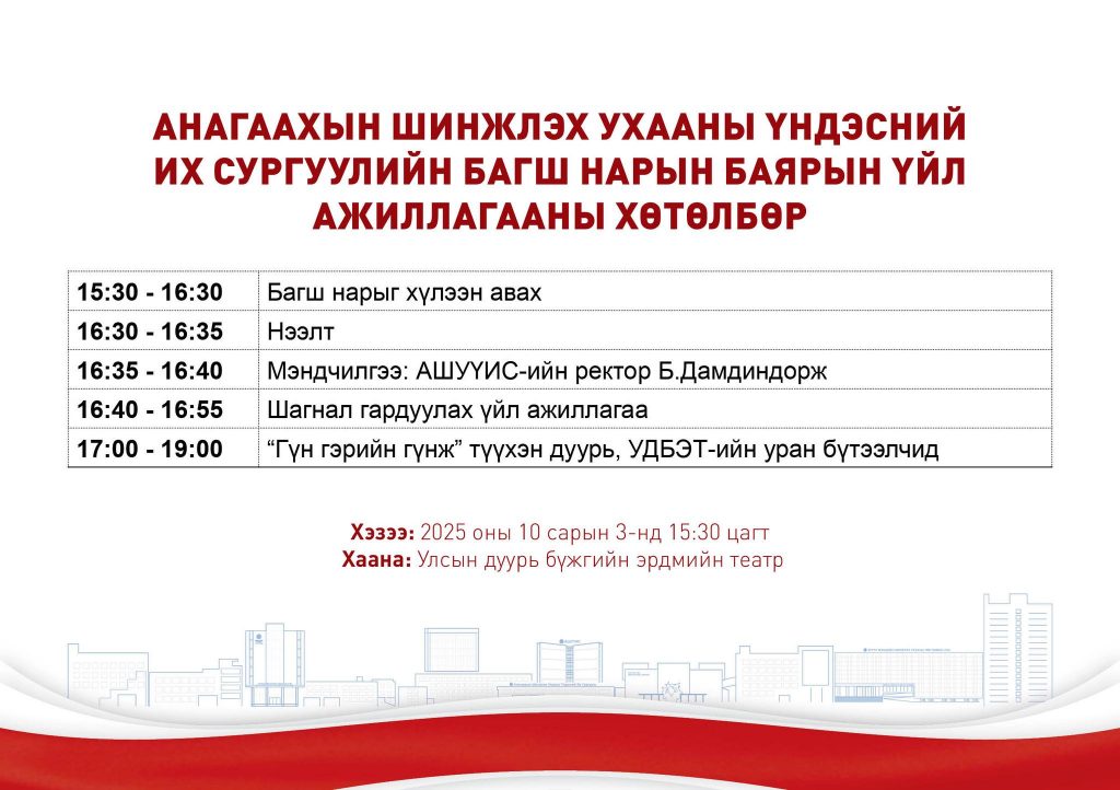 УРИЛГАBattsetseg DOctober 9, 2025МЭДЭЭ, Мэдээ АШУҮИС-ИЙН ЭРДЭМТЭН БАГШ ТА БҮГДИЙГ 2025 ОНЫ 10 САРЫН 03-НЫ ӨДРИЙН 15:30 ЦАГТ УЛСЫН ДУУРЬ БҮЖГИЙН ЭРДМИЙН ТЕАТРТ ХҮРЭЛЦЭН ИРЭХИЙГ УРЬЖ БАЙНА. Previous Post АХМАДЫН БАЯРЫН МЭНДИЙГ ӨРГӨН ДЭВШҮҮЛЬЕ Next Post МОНГОЛЫН УЛАМЖЛАЛТ НЭГТГЭМЭЛ АНАГААХ УХААН: ХӨГЖЛИЙН ОЛОЛТ, ЧИГ ХАНДЛАГА, ХЭТИЙН ТӨЛӨВ-III ОЛОН УЛСЫН ЭРДЭМ ШИНЖИЛГЭЭНИЙ ХУРАЛД УРЬЖ БАЙНА