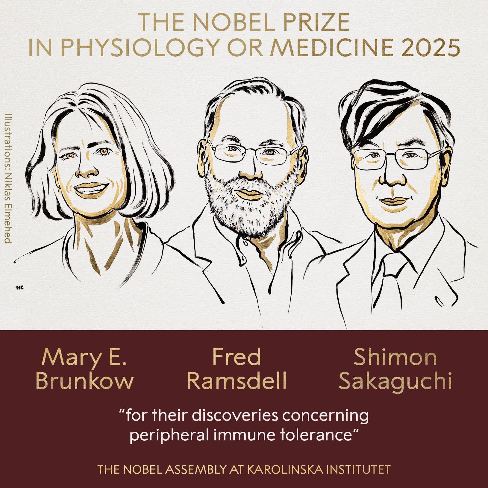Каролинска анагаах ухааны сургуульд байрлах Нобелийн хороо өнөөдөр 2025 оны “Физиологи ба анагаах ухааны Нобелийн шагнал”-ыг Мэри Э.Брунков, Фред Рамсделл, Шимон Сакагучи нарын “Захын дархлааны тэвчил”-ийн талаарх тэдний нээлтэд олгож буйгаа зарлалаа.