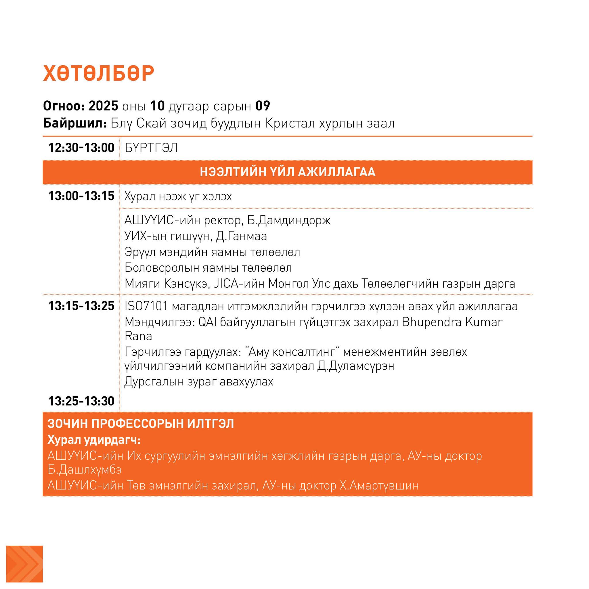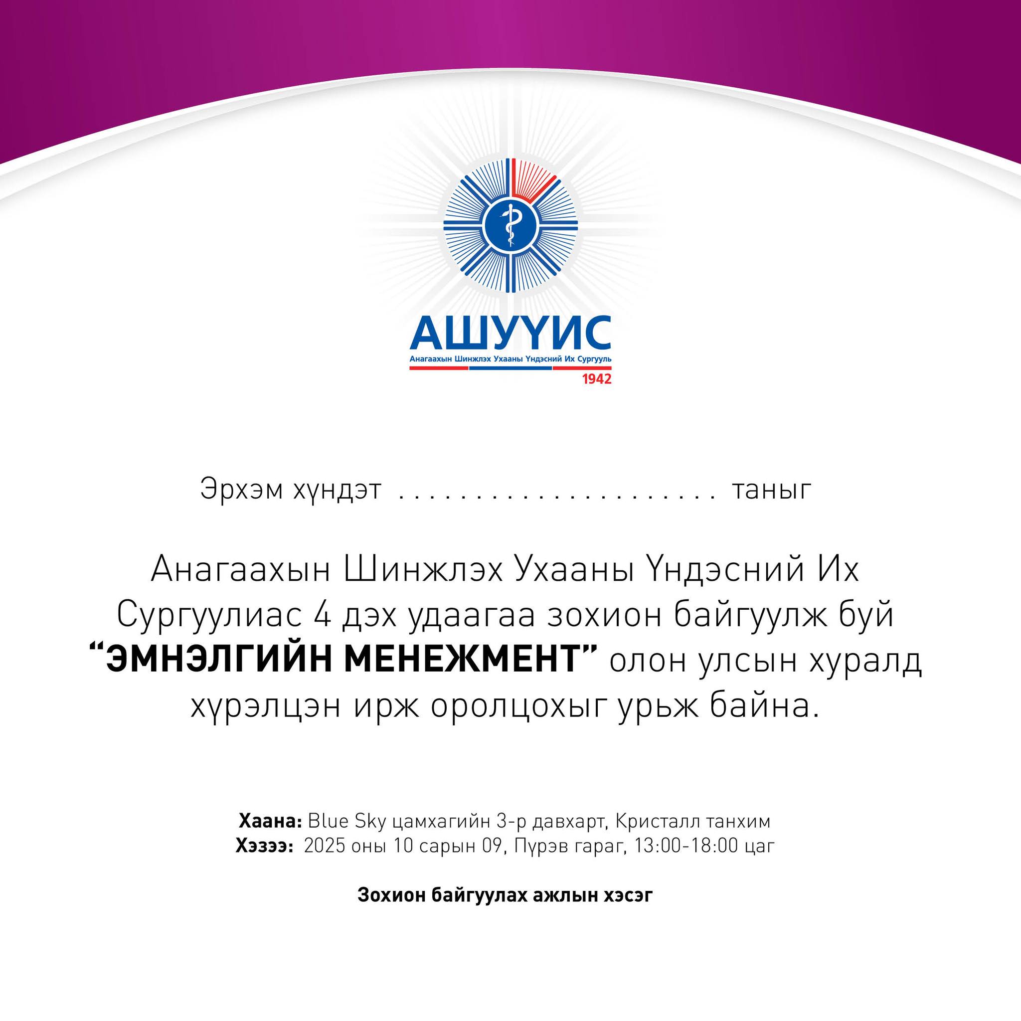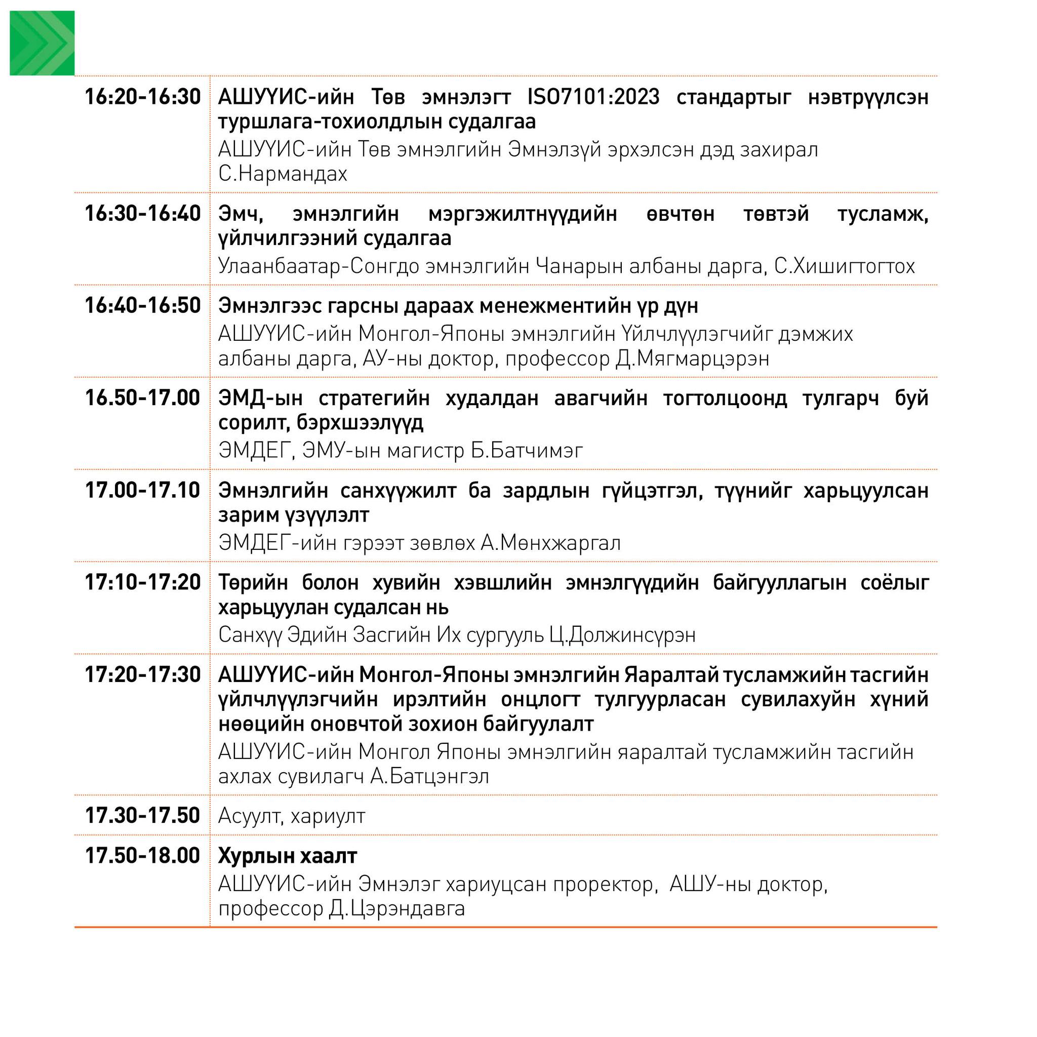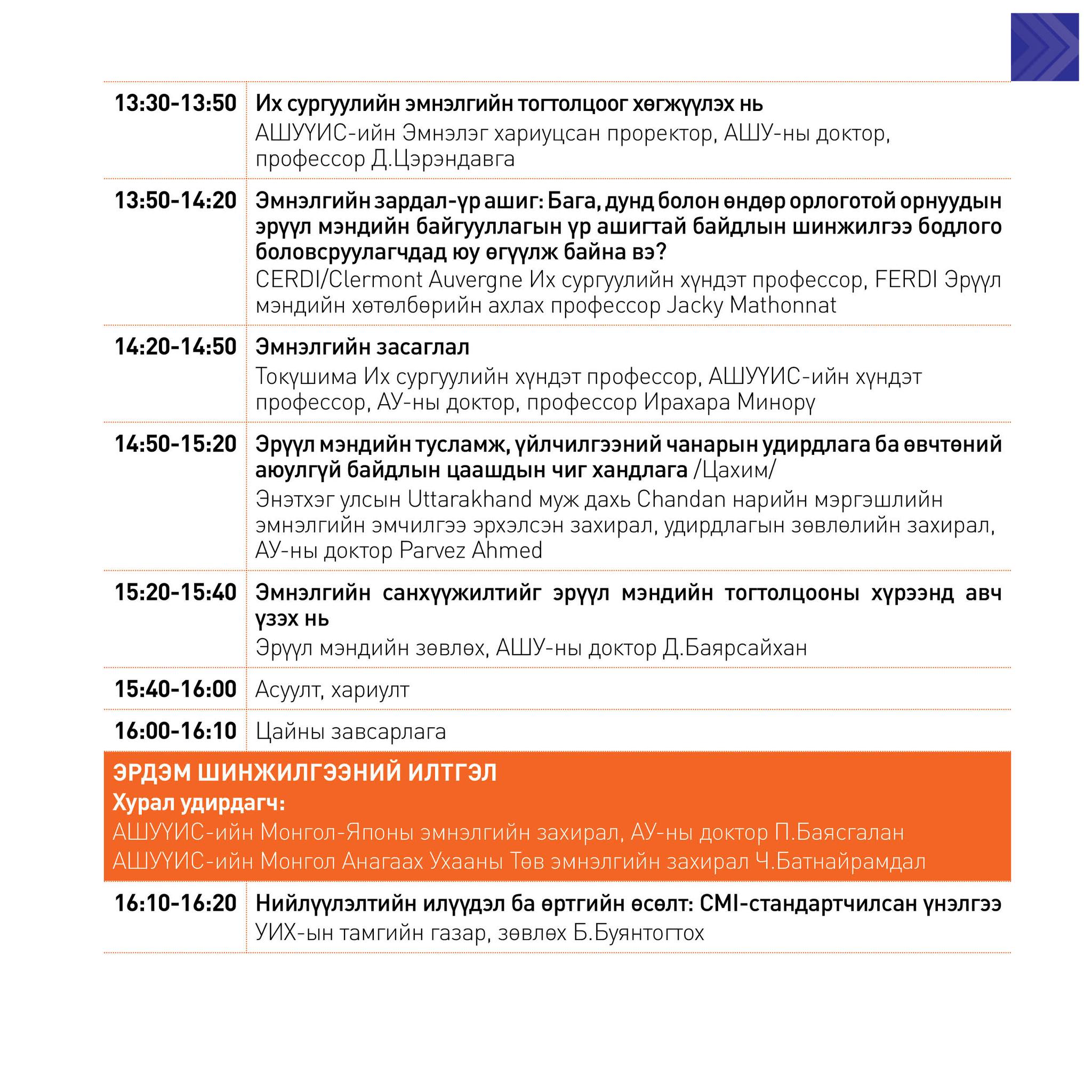 Монгол улсаас АШУ доктор, профессор Д.Цэрэндавга, АШУ доктор Баярсайхан нар урилгаар илтгэл тавьж эмнэлгийн удирдлага, менежмент чиглэлээр судалгааны үр дүнгээ танилцуулах шигшмэл 8 судлаач сонирхолтой илтгэл хэлэлцүүлэх болно.