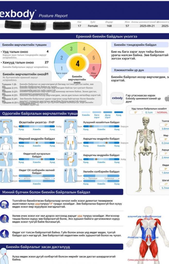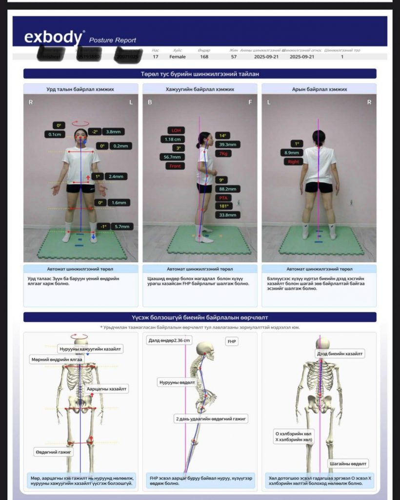 Энэхүү үзлэгээр хүүхдийн биеийн төрх байдлын өөрчлөлт, цаашид биеийн төрх байдлын өөрчлөлт дээр анхаарах асуудлууд, хийх шаардлагатай дасгалын зөвлөмжийг өгч ажиллалаа. Мөн нурууны мурийлтын эрт илрүүлэгт хамрагдсан хүүхдүүдээс цаашид хөдөлгөөн засал эмчилгээ болон нурууны X-ray зураг авахуулах шаардлагатай хүүхдүүдийг тодруулж зөвлөгөа мэдээлэл өгөв.