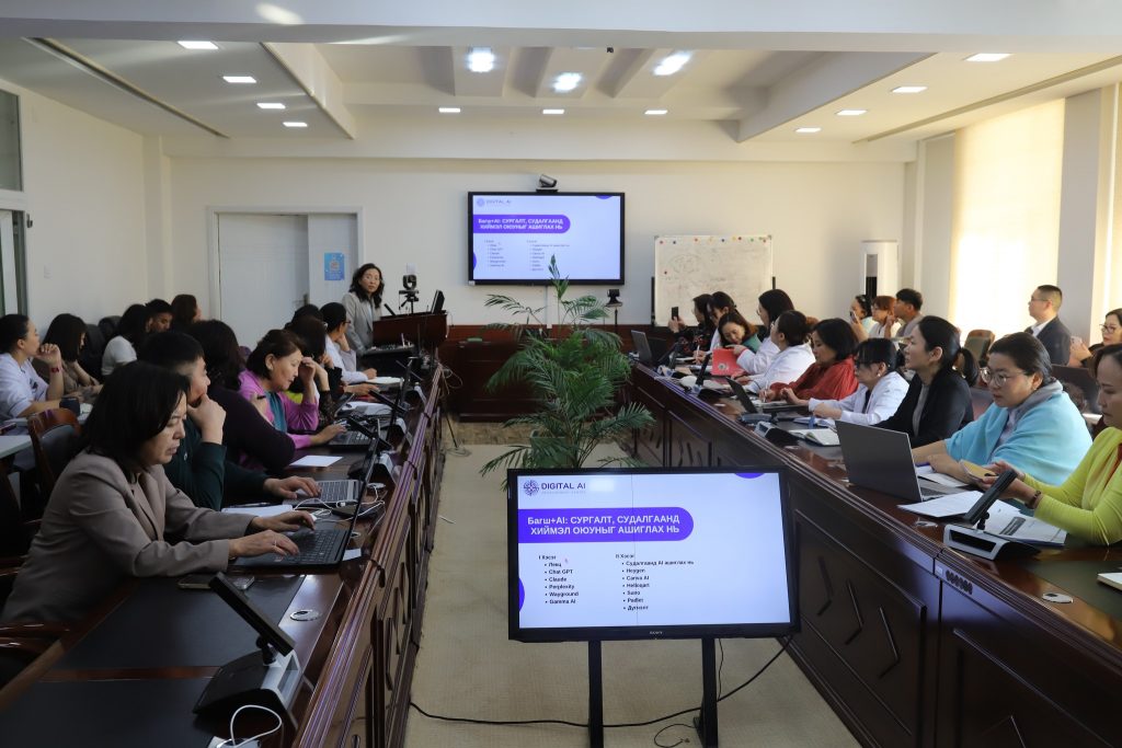 Анагаахын Шинжлэх Ухааны Үндэсний Их Сургуулийн Дархан-Уул аймаг дахь салбар Анагаах Ухааны Сургууль, “Дижитал шийдэл ба хиймэл оюун ухааны хөгжлийн төв”-тэй хамтран хиймэл оюун ухааны технологийг сургалт, судалгаанд үр дүнтэй ашиглах арга зүй эзэмшүүлэх “Багш+AI сургалт судалгаанд хиймэл оюун ухаан ашиглах нь” сургалтыг 2025 оны 10-р сарын 17-ны өдөр танхимаар зохион байгуулж тус сургуулийг 50 багш, ажилтан, арга зүйч хамрагдав. Сургалтыг Санхүү, Эдийн Засгийн Их Сургуулийн ахлах багш, доктор Л.Эрдэнэсайхан, багш Д.Хулан нар хөтлөн явуулсан бөгөөд хиймэл оюун ухааны үндсэн ойлголт, боломж, AI технологи ашиглан хичээлийн агуулга боловсруулах, хичээл удирдах, илтгэл бэлтгэх, видео тоглуулах, багш өөрийнхөө AI дүрийг бүтээх, дуу зохиох, суралцагчдын оролцоог нэмэгдүүлэх, AI технологийг ёс зүйтэй, хариуцлагатай ашиглах зарчмууд, chatgpt, claude.ai/new, perplexity.ai, suno, gamma.app, wayground, heygen программууд дээр дадлага хийж, даалгавар гүйцэтгэлээ. Сургалтын үеэр эм найруулагчийн ангийн оюутнууд мэргэжил сурталчлах аяны хүрээнд сургалтад оролцогчдод хүчилтөрөгчийн коктель, халуун чацарганаар үйлчиллээ.
