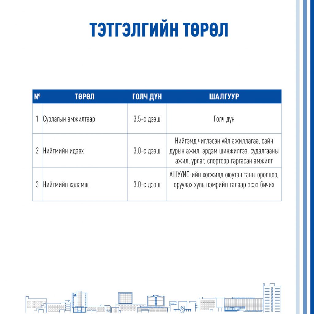 2.Нийгмийн идэвх, урлаг, спорт, эрдэм шинжилгээ, судалгааны чиглэлээр тэтгэлэг авах хүсэлтэй бол голч дүн 3.0 болон түүнээс дээш байх ба нийгэмд чиглэсэн үйл ажиллагаа, хийсэн ажил, судалгааны бүтээл, урлаг спортод гаргасан амжилтынхаа талаар бичнэ.