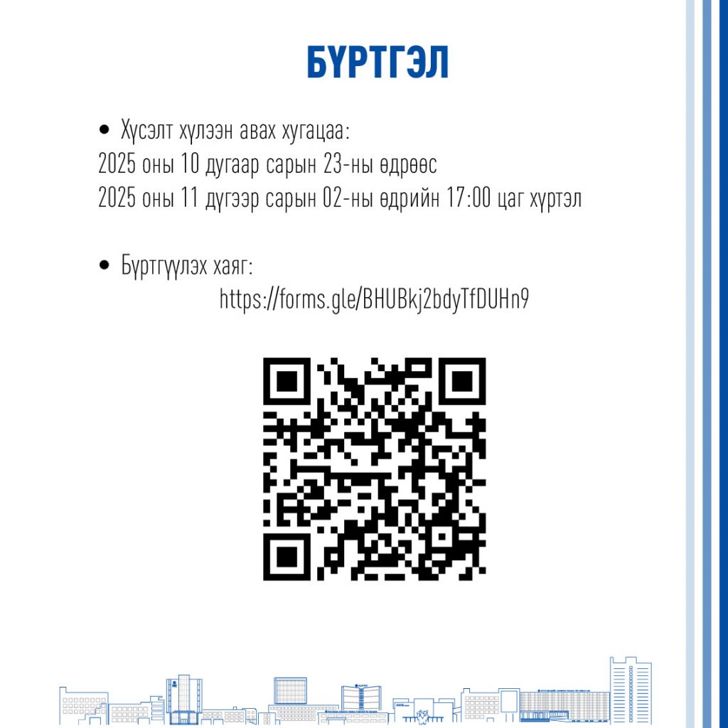 · Хүсэлтийг 2025 оны 11 сарын 02-ны өдрийн 17:00 цаг хүртэл формоор хүлээн авна.
