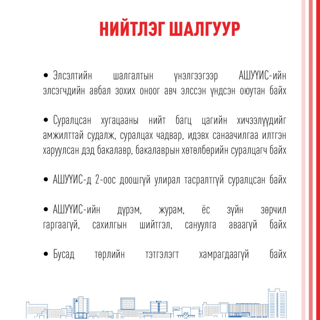 · Элсэлтийн шалгалтын үнэлгээгээр АШУҮИС-ийн элсэгчдийн авбал зохих оноог авч элссэн үндсэн оюутан байх