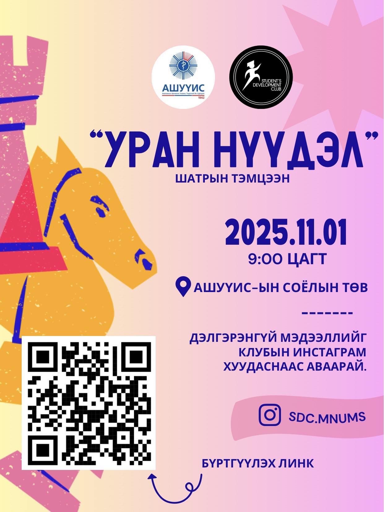 АШУҮИС-ийн “Оюутны хөгжил хөтөлбөр”-ийн “Үлгэрлэгч оюутан” дэд хөтөлбөрийн “Оюутны эрхийг хамгаалах сарын аян”- ы хүрээнд “Оюутны хөгжил удирдлагын газар”-ын дэргэхэд “Оюутны хөгжлийн клуб”-ээс зохион байгуулж буй оюутан залуусын чөлөөт цагийг зөв боловсон өнгөрүүлэх, логик сэтгэлгээг хөгжүүлэх, оюуны спортыг олон нийтэд сурталчлан таниулах, цаашид АШУҮИС-ийн шигшээ багийг бүрдүүлэх зорилгоор “Уран нүүдэл” шатрын тэмцээнийг зохион байгуулж байна.