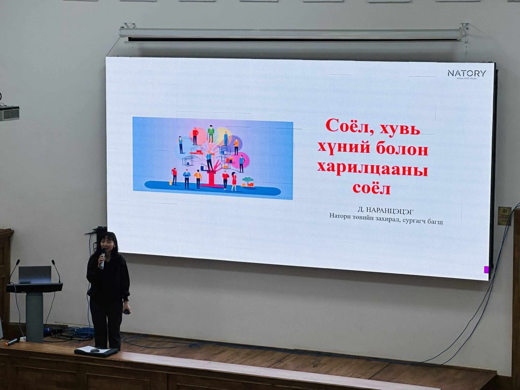 Тус нээлттэй хэлэлцүүлэгт Хувь хүний хөгжлийн NATORI төвийн захирал Д.Наранцэцэг соёлтой, ёс зүйт оюутан байх талаар сонирхолтой хэлэлцүүлэг өрнүүллээ.