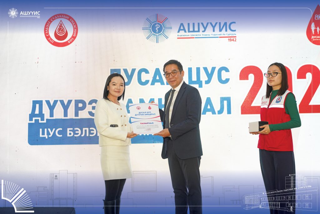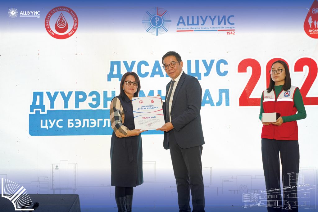 Аяны хүрээнд АШУҮИС-ийн ректор Б.Дамдиндорж донорын үйлсийг дэмжиж, цусны нөөцийг нэмэгдүүлэхэд хувь нэмрээ оруулсан төрийн болон хувийн хэвшлийн 20 гаруй байгууллага, хамт олон, их дээд сургуулиудад талархал гардууллаа.