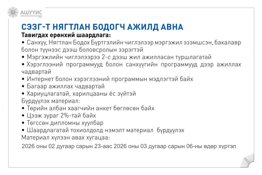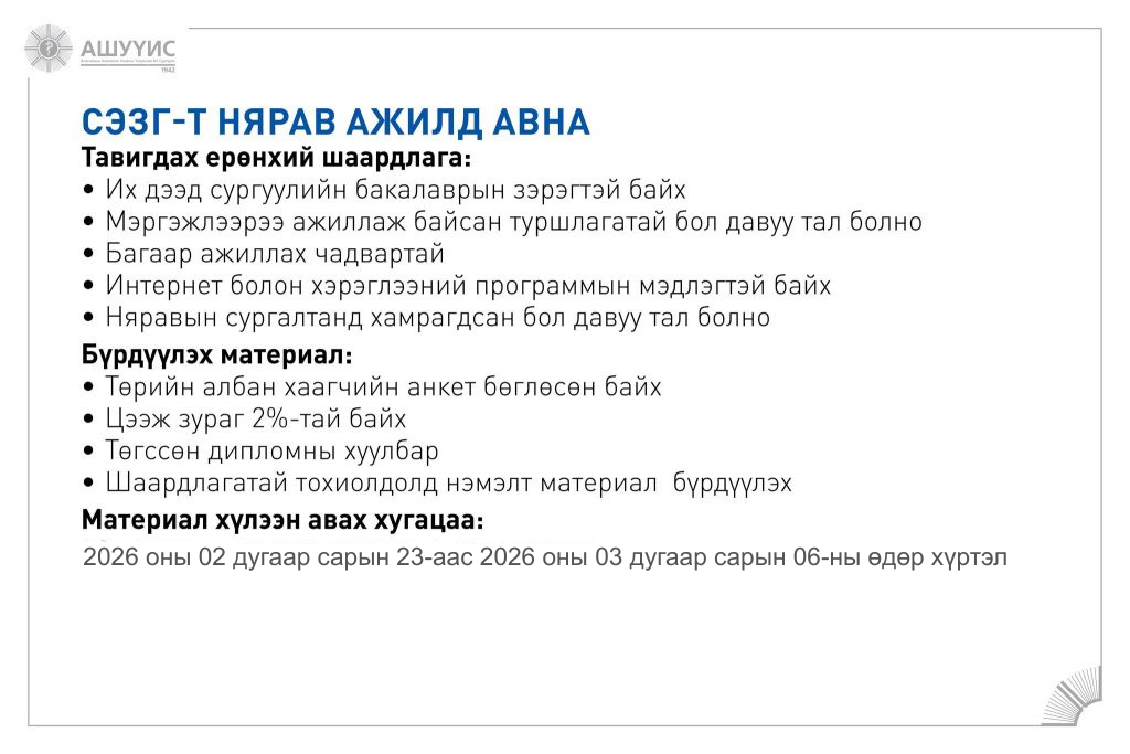 Материал хүлээн авах : 2026 оны 03 дугаар сарын 06-ны өдрийн 17:00 цаг хүртэл АШУҮИС-ийн Төв байрны 2 давхарт Захиргаа, хүний нөөцийн газрын /222 тоот/ өрөөнд цаасан хэлбэрээр авчирч өгнө үү.