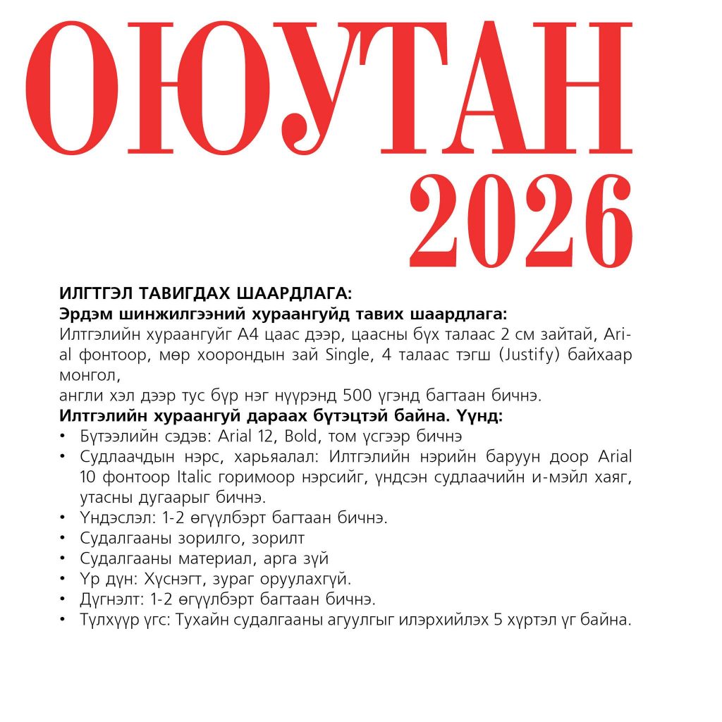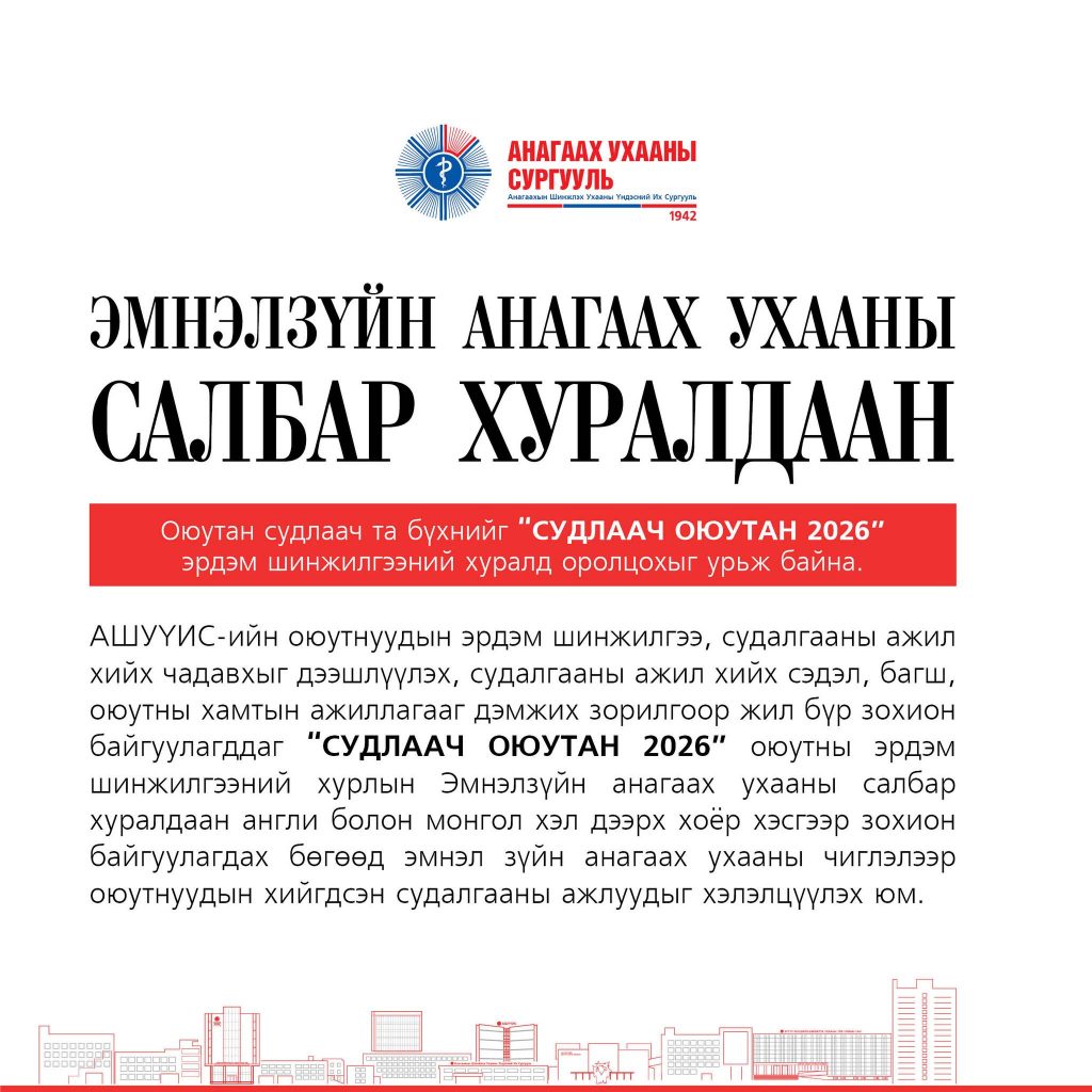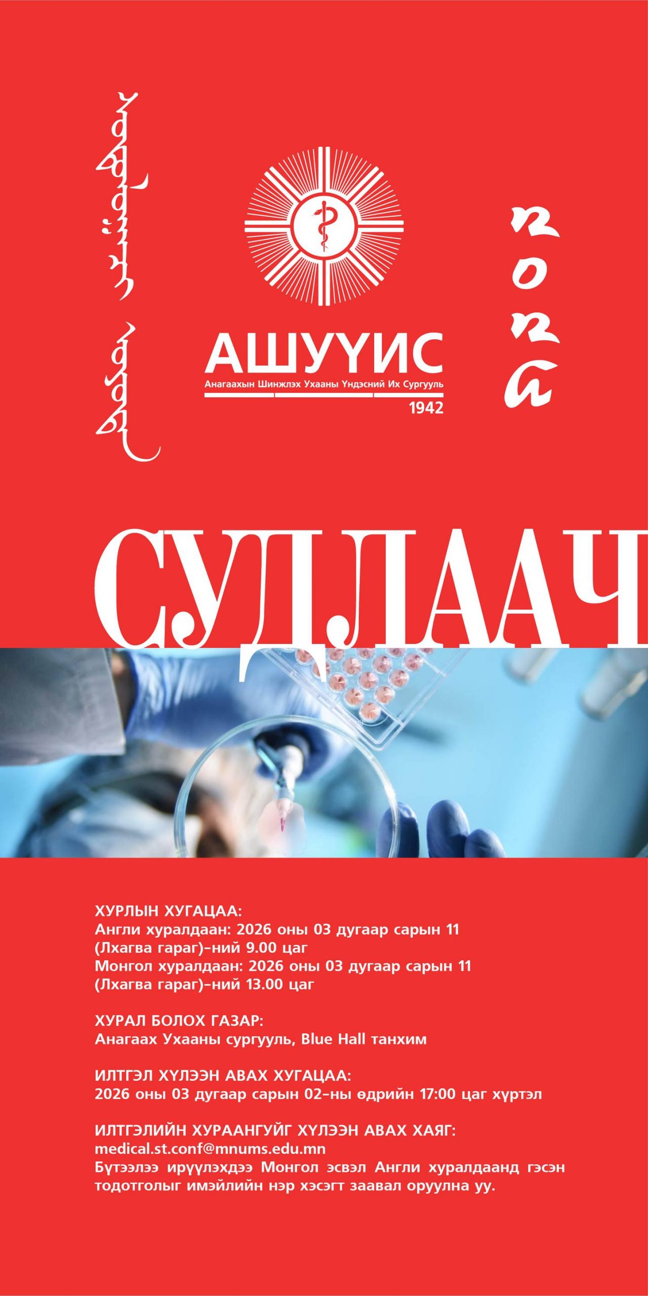 АШУҮИС-ийн оюутнуудын эрдэм шинжилгээ, судалгааны ажил хийх чадавхыг дээшлүүлэх, судалгааны ажил хийх сэдэл, багш, оюутны хамтын ажиллагааг дэмжих зорилгоор жил бүр зохион байгуулагддаг “СУДЛААЧ ОЮУТАН 2026” оюутны эрдэм шинжилгээний хурлын Эмнэлзүйн анагаах ухааны салбар хуралдаан англи болон монгол хэл дээрх хоёр хэсгээр зохион байгуулагдах бөгөөд эмнэл зүйн анагаах ухааны чиглэлээр оюутнуудын хийгдсэн судалгааны ажлуудыг хэлэлцүүлэх юм.