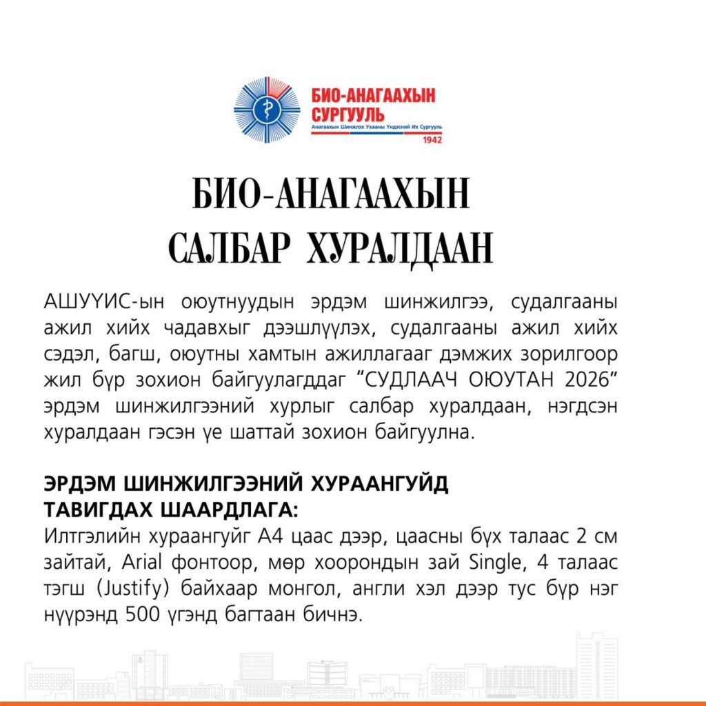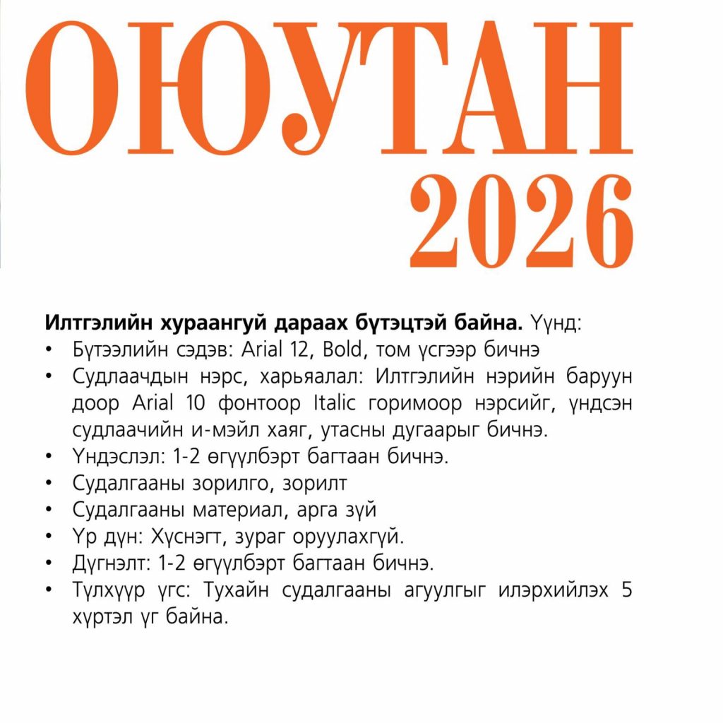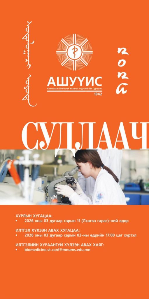 АШУҮИС-ийн оюутнуудын эрдэм шинжилгээ, судалгааны ажил хийх чадавхыг дээшлүүлэх, судалгааны ажил хийх сэдэл, багш, оюутны хамтын ажиллагааг дэмжих зорилгоор жил бүр зохион байгуулагддаг “СУДЛААЧ ОЮУТАН 2026” олон улсын оюутны эрдэм шинжилгээний хурал болно.