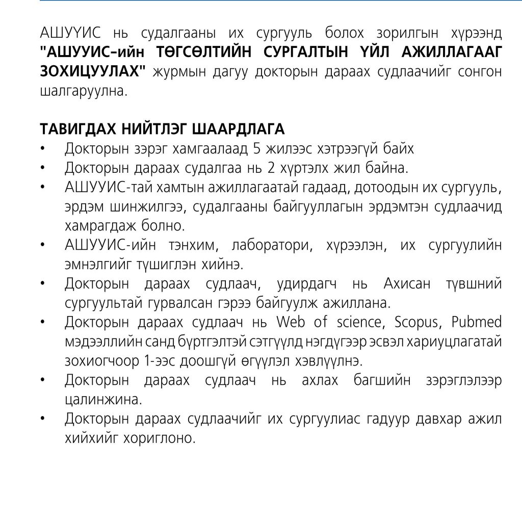 АШУҮИС нь судалгааны их сургууль болох зорилгын хүрээнд “АШУУИС-ийн ТӨГСӨЛТИЙН СУРГАЛТЫН ҮЙЛ АЖИЛЛАГААГ ЗОХИЦУУЛАХ” журмын дагуу докторын дараах судлаачийг сонгон шалгаруулна.