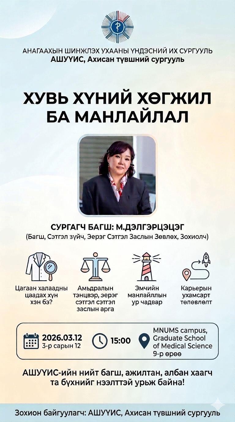 АШУҮИС-ийн багш, эмч, судлаач, мэргэжилтэн, ажилтнуудын мэдлэг, ур чадварыг хөгжүүлэх, ажлын гүйцэтгэлийг сайжруулах, баг хамт олны эерэг уур амьсгал, идэвх оролцоог нэмэгдүүлэх зорилгоор захиргаа, хүний нөөцийн газар болон ахисан түвшний сургууль хамтран “ХУВЬ ХҮНИЙ ХӨГЖИЛ БА МАНЛАЙЛАЛ” сургалтыг зохион байгуулж байна.