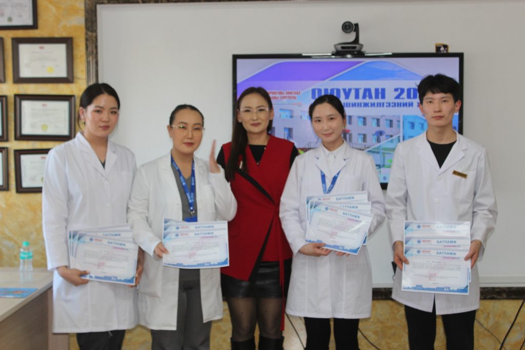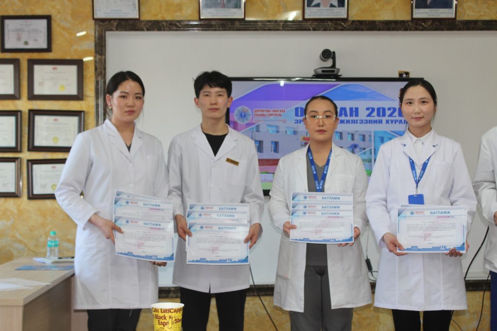 – Гутгаар байранд Анагаахын 4-р дамжааны оюутан Э.Сарантуяа нарын /Удирдсан багш Д. Одонтуяа ЭЭСБАС-ын багш/ “Дорноговь аймгийн төмөр замын эрэгтэй ажилчдын дунд зүрх судасны өвчний эрсдэлт хүчин зүйлийг лабораторийн шинжилгээний зарим үзүүлэлтээр үнэлэх нь“ сэдэвт илтгэл тус тус шалгарлаа.