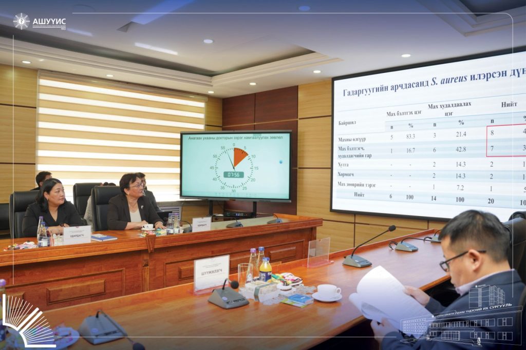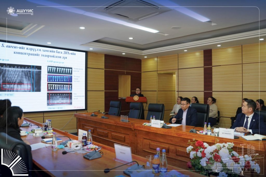 Докторант ДОРЖГОЧОО овогтой АМГАЛАНЗАЯАГИЙН туурвисан “МАХ НИЙЛҮҮЛЭХ ЦЭГЭЭС ИЛЭРСЭН STAPHYLOCOCCUS AUREUS-ИЙН ХОРУУ ЧАНАР БОЛОН ГЕНОТИПИЙН СУДАЛГАА” сэдэвт судалгааны ажлын урьдчилсан хамгаалалт боллоо.