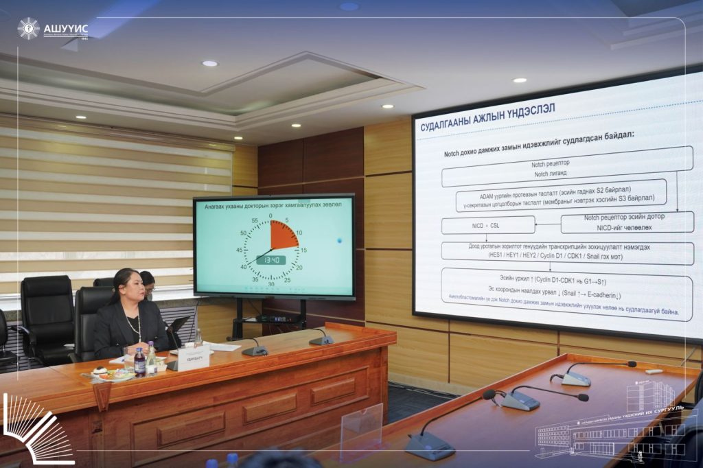 Докторант ГАВЬЯАТ овогтой БУЯНБАТЫН туурвисан “АМЕЛОБЛАСТОМАГИЙН ЭСИЙН ҮРЖИЛ, ЦӨМРӨЛТӨД NOTCH ДОХИО ДАМЖИХ ЗАМЫН ҮЗҮҮЛЭХ НӨЛӨӨГ СУДАЛСАН ДҮН” сэдэвт судалгааны ажлын урьдчилсан хамгаалалт боллоо.