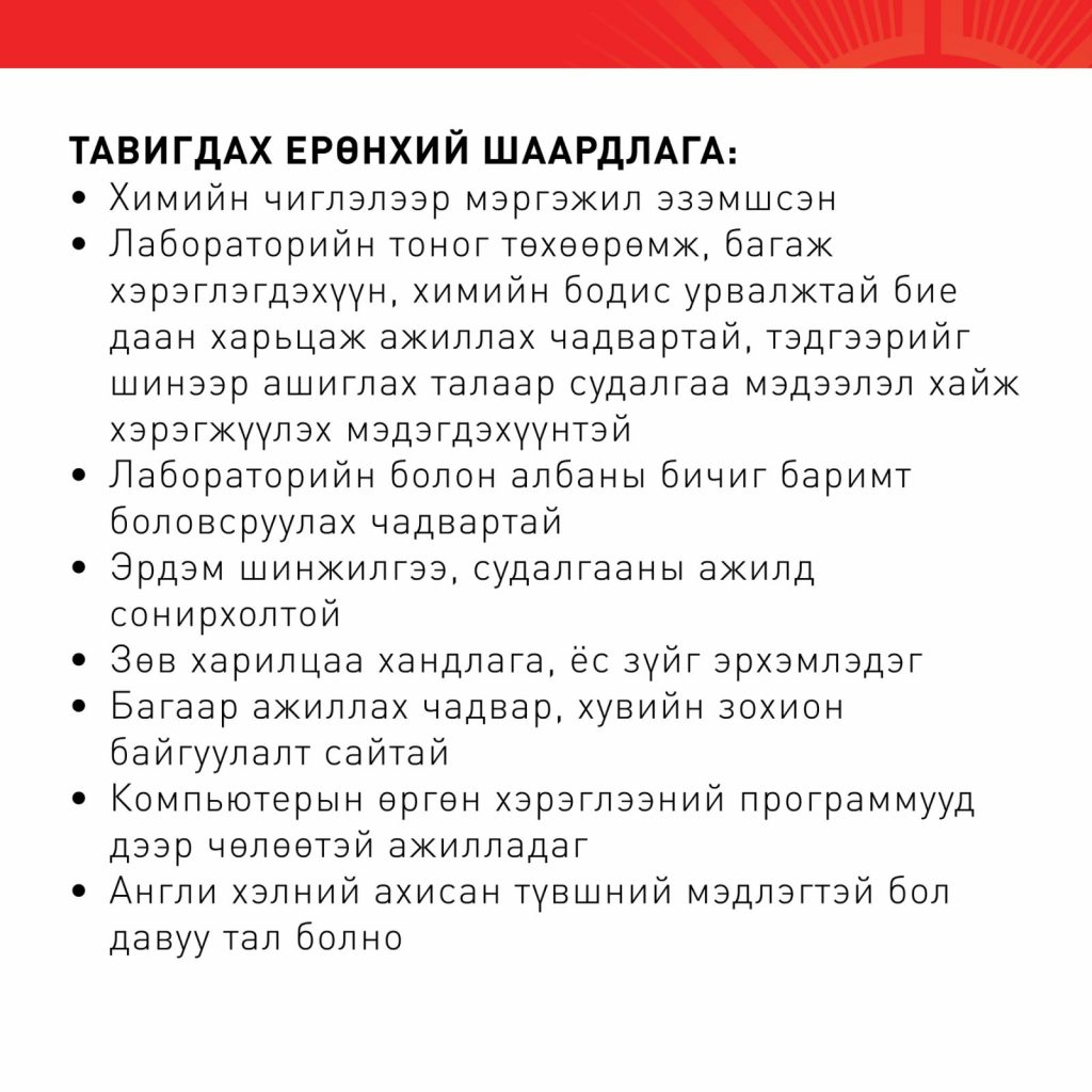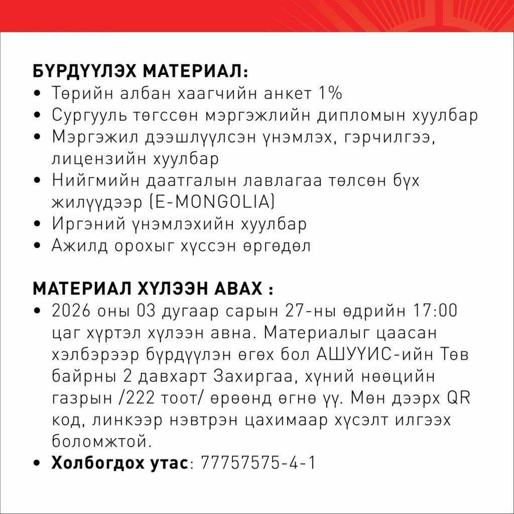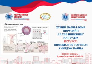 ДАРААХ АЖЛЫН БАЙРАНД АЖИЛТАН ШАЛГАРУУЛЖ АВНАBattsetseg DMarch 26, 2026МЭДЭЭ, Мэдээ Доорх линкээр орж анкет бөглөнө үү. https://forms.gle/jZ5jF5xjNHFBQWPLA Previous Post Хүний папиллома вирус (ХПВ) нь умайн хүзүүний хорт хавдрын гол шалтгаануудын нэг бөгөөд 200 гаруй төрөлтэйгөөс 40-өөд төрөл нь хүний биед өвчин үүсгэдэг. Дэлхий даяар жил бүр ойролцоогоор 600,000 гаруй эмэгтэйчүүд хүний папиллома вирусээс үүдэлтэй умайн хүзүүний хорт хавдраар оношлогддог. Next Post “СУДЛААЧ ОЮУТАН 2026” ОЛОН УЛСЫН ОЮУТНЫ ЭРДЭМ ШИНЖИЛГЭЭНИЙ ХУРЛЫН НЭГДСЭН ХУРАЛДААН АМЖИЛТТАЙ ЗОХИОН БАЙГУУЛАГДЛАА