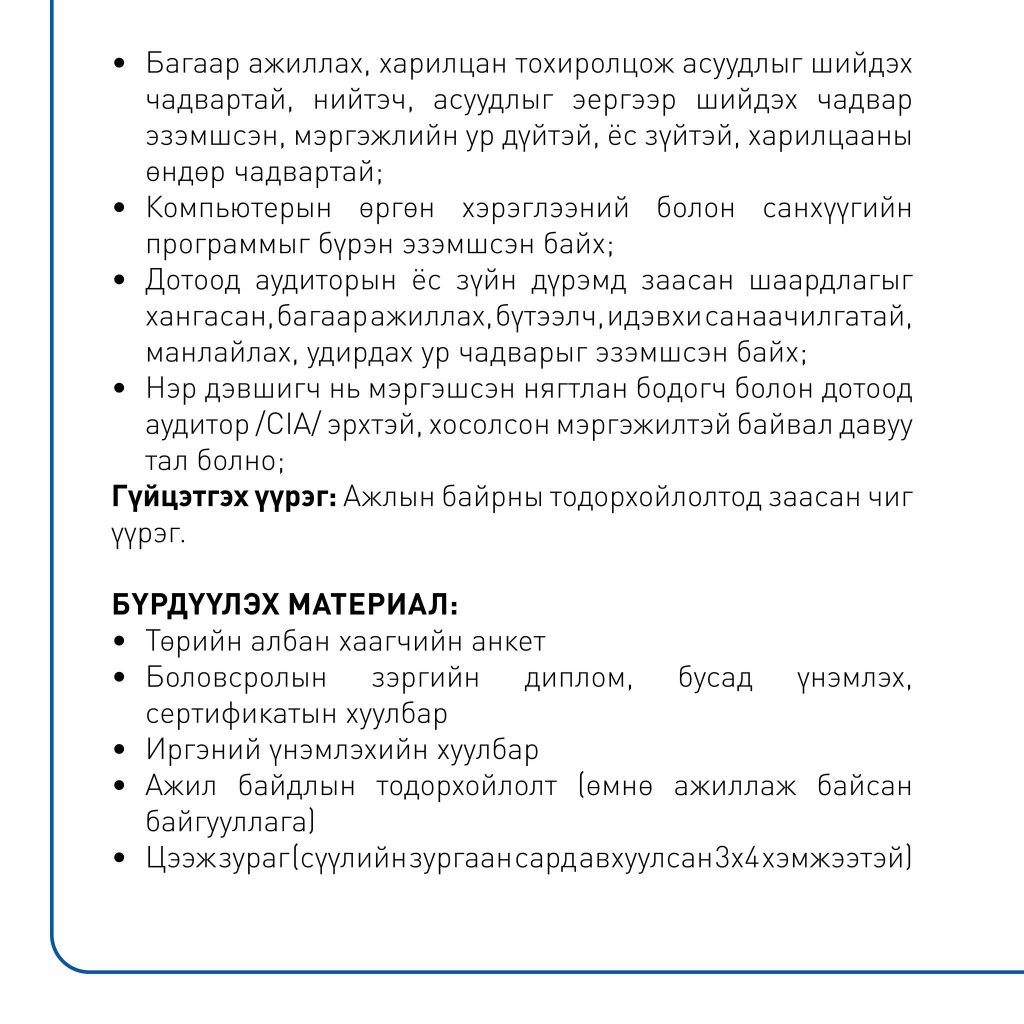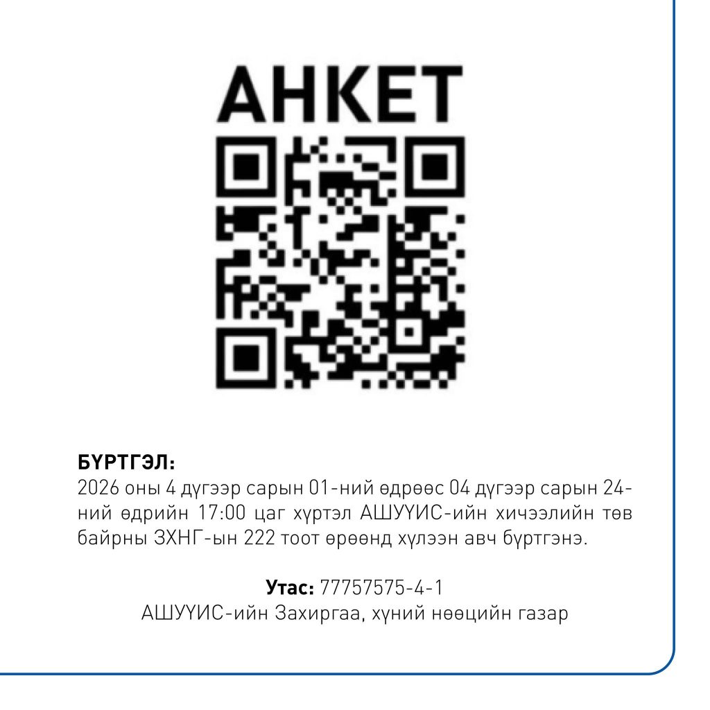 ДАРААХ АЖЛЫН БАЙРАНД АЖИЛТАН ШАЛГАРУУЛЖ АВНАBattsetseg DMarch 31, 2026МЭДЭЭ, Мэдээ Previous Post ГАМШГИЙН АЮУЛЫН ЗАРЛАН МЭДЭЭЛЭХ ДУУТ ДОХИОГООР АЖИЛЛАЛАА Next Post ЭРҮҮЛ МЭНДИЙН БОЛОВСРОЛЫН ХАМТАРСАН МАГИСТРЫН ХӨТӨЛБӨР ХЭРЭГЖҮҮЛНЭ