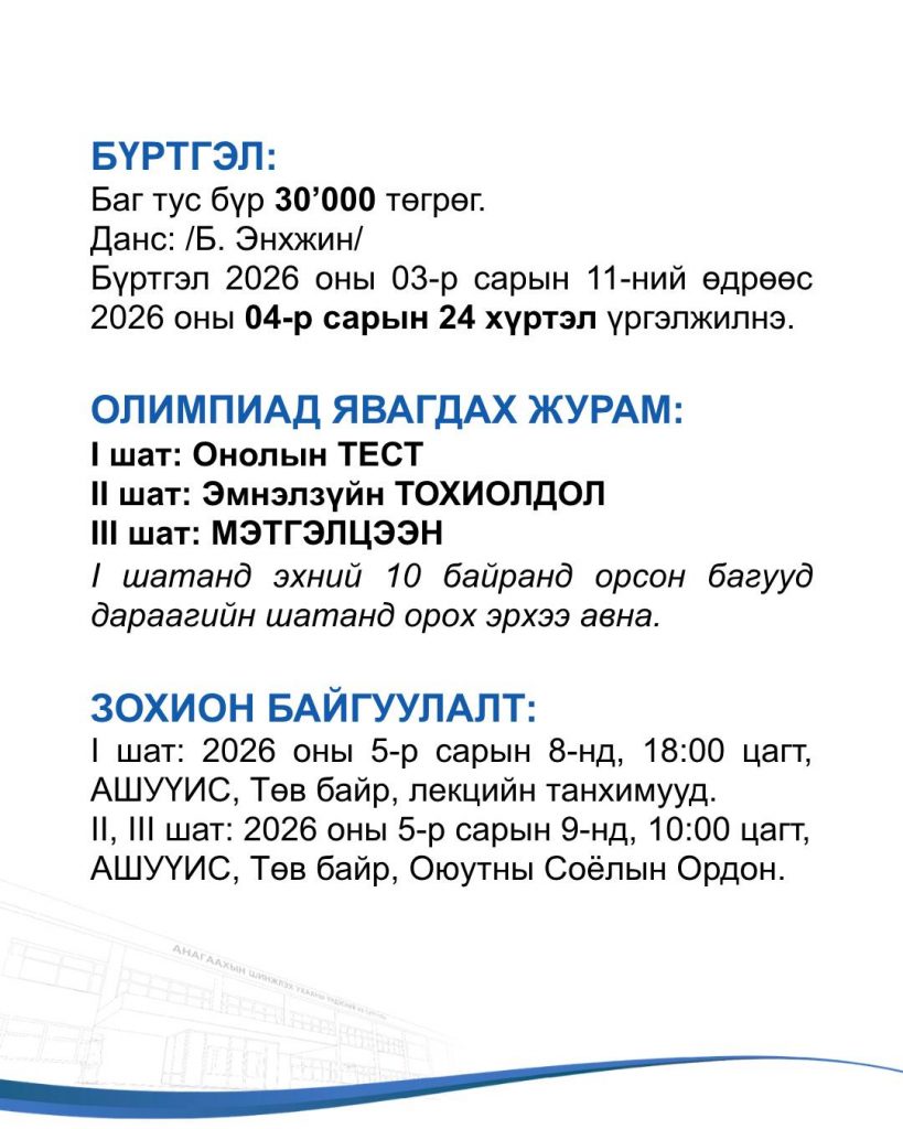 Бүртгэл: 2026 оны 3-р сарын 11-ний 18:00 цагаас 4-р сарын 24-ний 18:00 цаг хүртэл үргэлжилнэ.