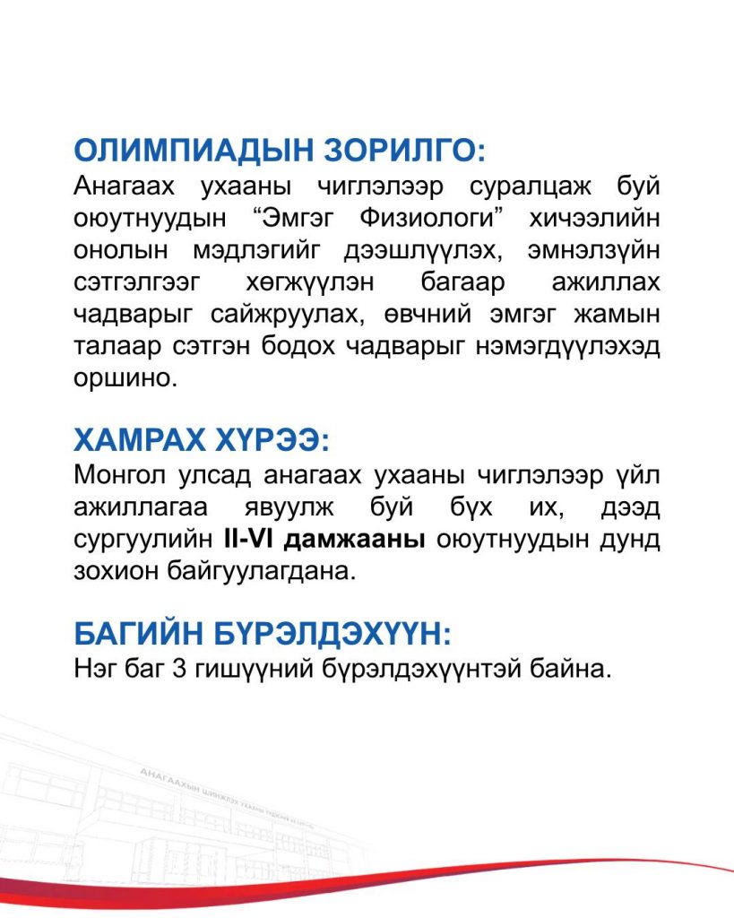 Анагаах ухааны чиглэлээр суралцаж буй оюутнуудын Эмгэг физиологийн хичээлийн онолын мэдлэгийг дээшлүүлэх, эмнэлзүйн сэтгэлгээ, багаар ажиллах чадварыг хөгжүүлэх, өвчний эмгэгжамын ойлголтыг нэмэгдүүлэх зорилгоор Эмгэг физиологийн улсын олимпиадыг 4-дэх удаагаа зохион байгуулах гэж байна.