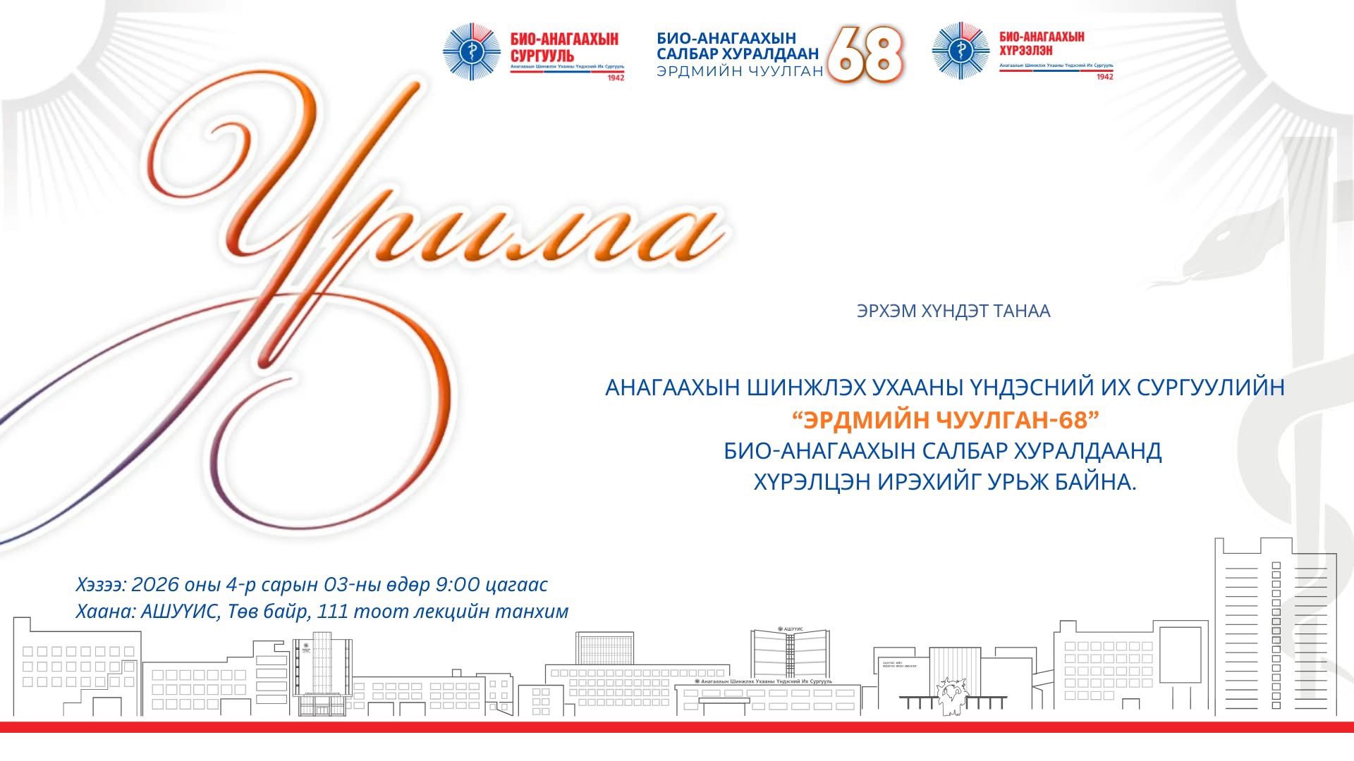 ЭРДЭМТЭН БАГШ, ЭМЧ, СУДЛААЧ ТА БҮХНИЙГ “ЭРДМИЙН ЧУУЛГАН-68” АНАГААХ УХААНЫ САЛБАР ХУРАЛДААНД ХҮРЭЛЦЭН ИРЭХИЙГ УРЬЖ БАЙНА March 31, 2026