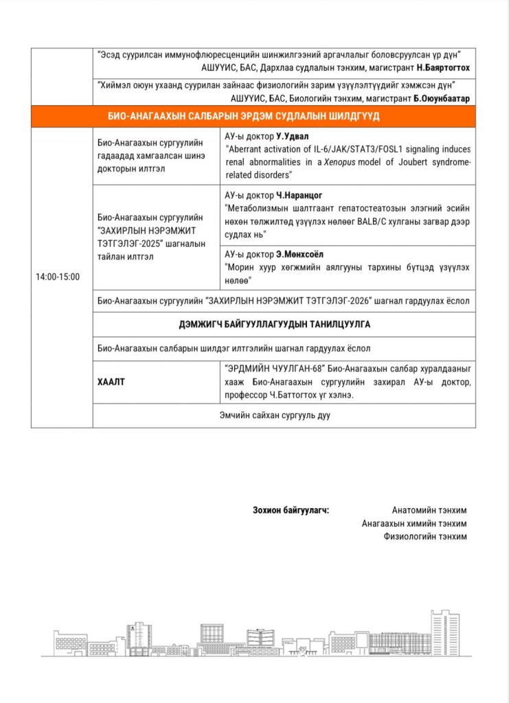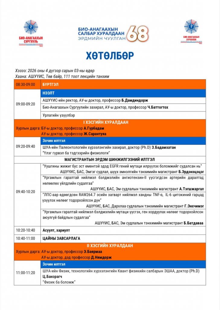 ЭРХЭМ ХҮНДЭТ ЭРДЭМТЭН БАГШ, ЭМЧ, СУДЛААЧ, АЖИЛТАН ТА БҮХНИЙГ АШУҮИС-ИЙН “ЭРДМИЙН ЧУУЛГАН-68” БИО-АНАГААХЫН САЛБАР ХУРАЛДААНД ХҮРЭЛЦЭН ИРЭХИЙГ УРЬЖ БАЙНАBattsetseg DMarch 31, 2026МЭДЭЭ, Мэдээ Previous Post ЭРХЭМ ХҮНДЭТ ЭРДЭМТЭН БАГШ, СУДЛААЧ, ЭМЧ, ЭМНЭЛГИЙН МЭРГЭЖИЛТЭН, АЖИЛТАН, АЛБАН ХААГЧИД ТА БҮХНИЙГ АШУҮИС-ИЙН “ЭРДМИЙН ЧУУЛГАН-68” АНАГААХ УХААНЫ БОЛОВСРОЛ СУДЛАЛЫН САЛБАР ХУРАЛДААНД ХҮРЭЛЦЭН ИРЭХИЙГ УРЬЖ БАЙНА Next Post АШУҮИС-ИЙН “ЭРДМИЙН ЧУУЛГАН-68” УЛАМЖЛАЛТ АНАГААХ УХААНЫ САЛБАР ХУРАЛДААНД ХҮРЭЛЦЭН ИРЭХИЙГ УРЬЖ БАЙНА