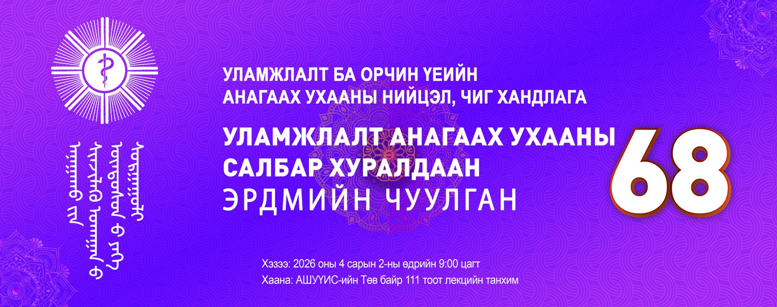 ЭРДЭМТЭН БАГШ, ЭМЧ, СУДЛААЧ ТА БҮХНИЙГ “ЭРДМИЙН ЧУУЛГАН-68” АНАГААХ УХААНЫ САЛБАР ХУРАЛДААНД ХҮРЭЛЦЭН ИРЭХИЙГ УРЬЖ БАЙНА March 31, 2026