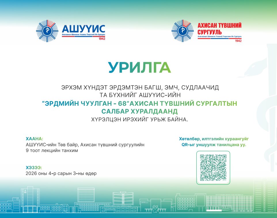 ЭРДЭМТЭН БАГШ, ЭМЧ, СУДЛААЧ ТА БҮХНИЙГ “ЭРДМИЙН ЧУУЛГАН-68” АНАГААХ УХААНЫ САЛБАР ХУРАЛДААНД ХҮРЭЛЦЭН ИРЭХИЙГ УРЬЖ БАЙНА March 31, 2026