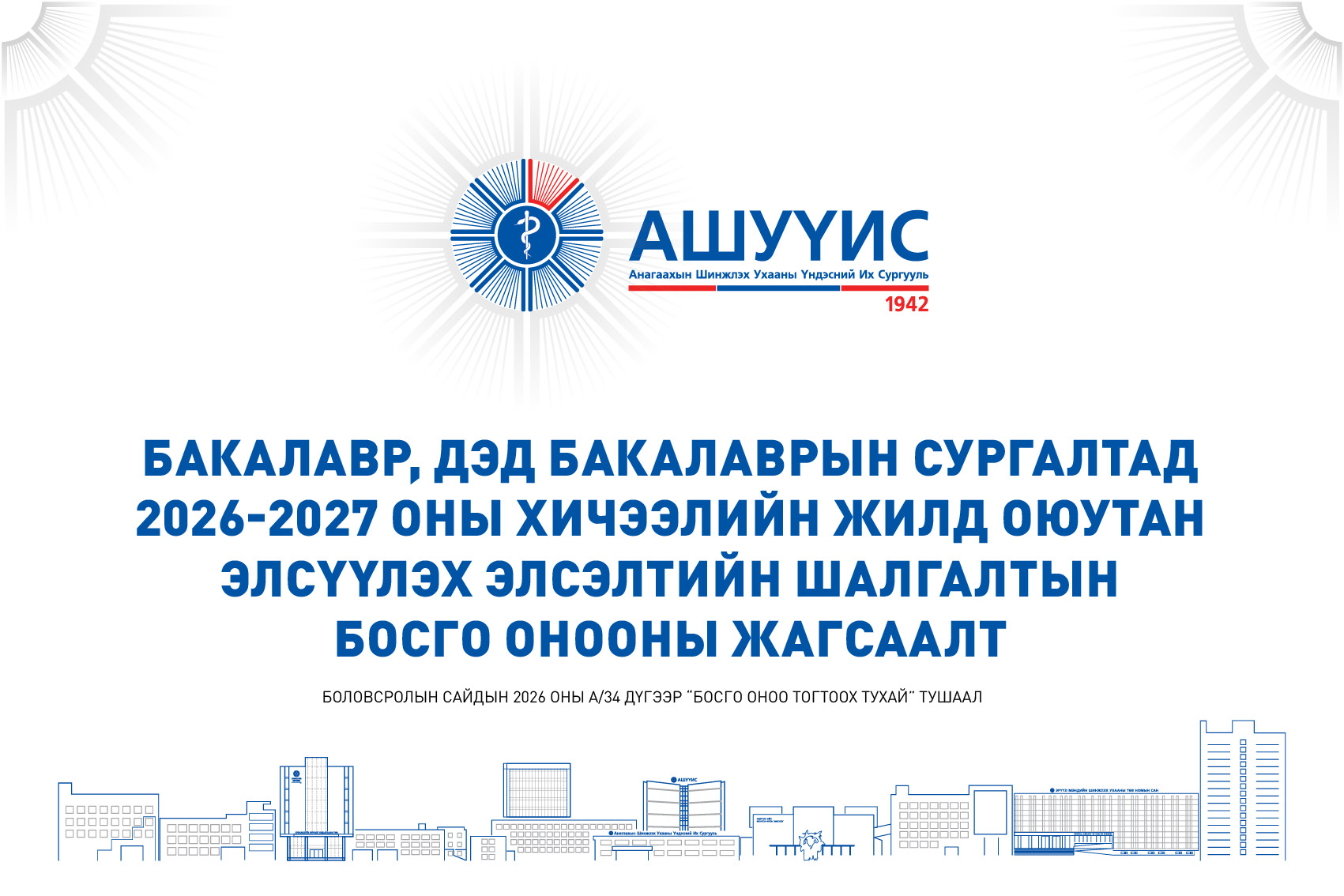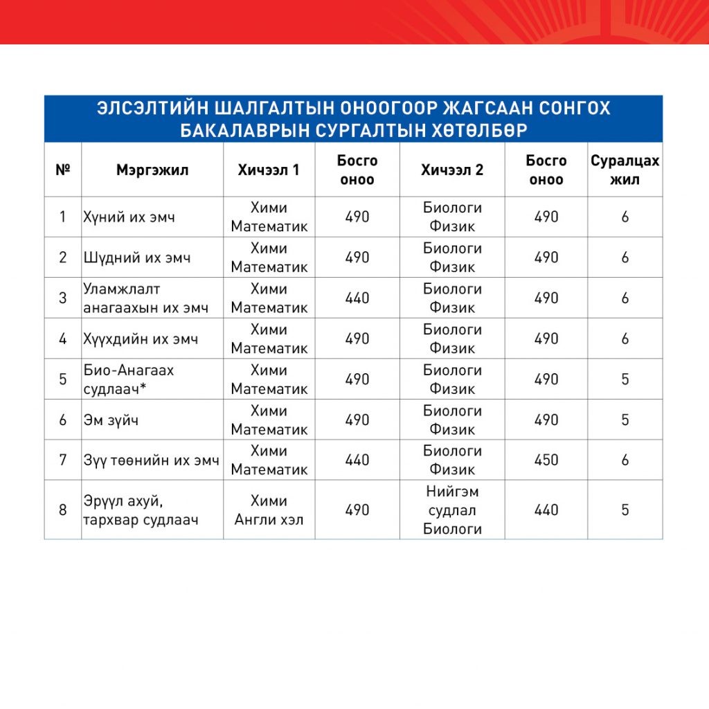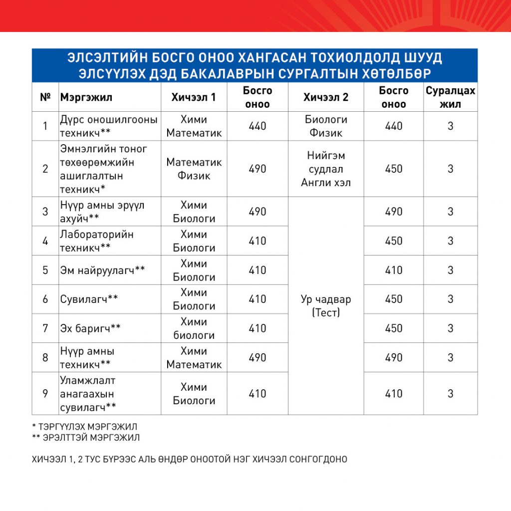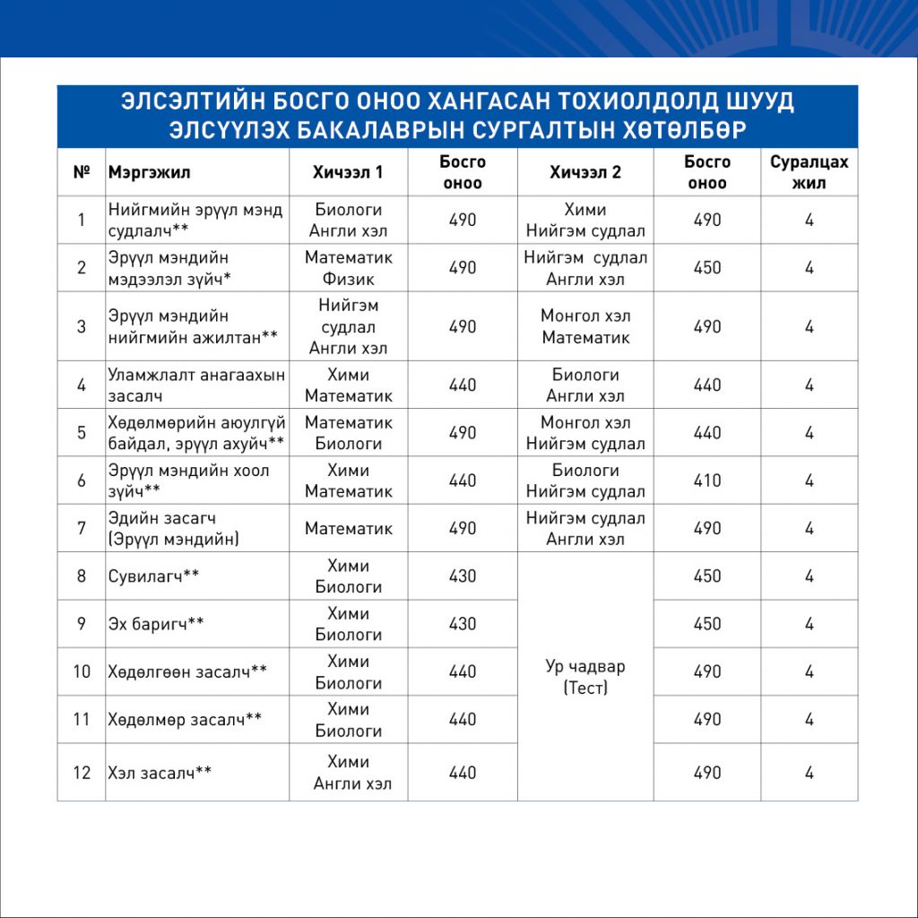 БАКАЛАВР, ДЭД БАКАЛАВРЫН СУРГАЛТАД 2026-2027 ОНЫ ХИЧЭЭЛИЙН ЖИЛД ОЮУТАН ЭЛСҮҮЛЭХ ЭЛСЭЛТИЙН ШАЛГАЛТЫН БОСГО ОНООНЫ ЖАГСААЛТBattsetseg DApril 8, 2026МЭДЭЭ, Мэдээ Previous Post АШУҮИС-ИЙН “ЭРДМИЙН ЧУУЛГАН-68” БИО-АНАГААХЫН САЛБАР ХУРАЛДААН АМЖИЛТТАЙ ЗОХИОН БАЙГУУЛАГДЛАА. Next Post АШУҮИС-ИЙН “ЭРДМИЙН ЧУУЛГАН–68” АХИСАН ТҮВШНИЙ СУРГАЛТЫН САЛБАР ХУРАЛДААНЫ ШИЛДЭГ ИЛТГЭГЧИД, СУДАЛГААНЫ БҮТЭЭЛҮҮД ШАЛГАРЛАА
